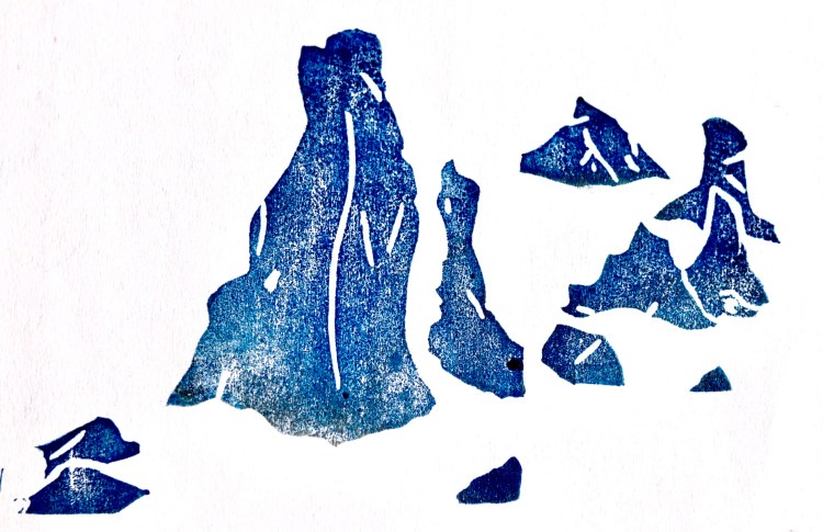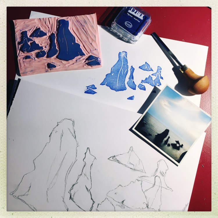 Et bien non, Belle-Ile n’a pas inauguré Moln. Mais elle aurait pu. C’est un de mes sujets récurrents, et pour cause, je l’ai beaucoup observée, croquée, respirée, peinte, parcourue mais pas encore en toutes saisons. Je reste une touriste à Belle-Ile et ça me chagrine parfois. Ce tampon est né d’un croquis fait à partir d’une photo que j’ai prise dans un contre-jour dessinant les formes des aiguilles.