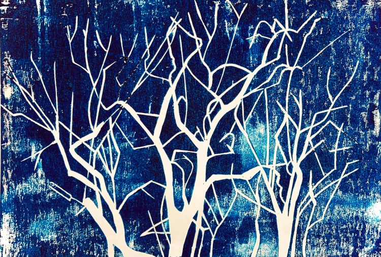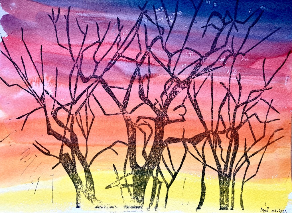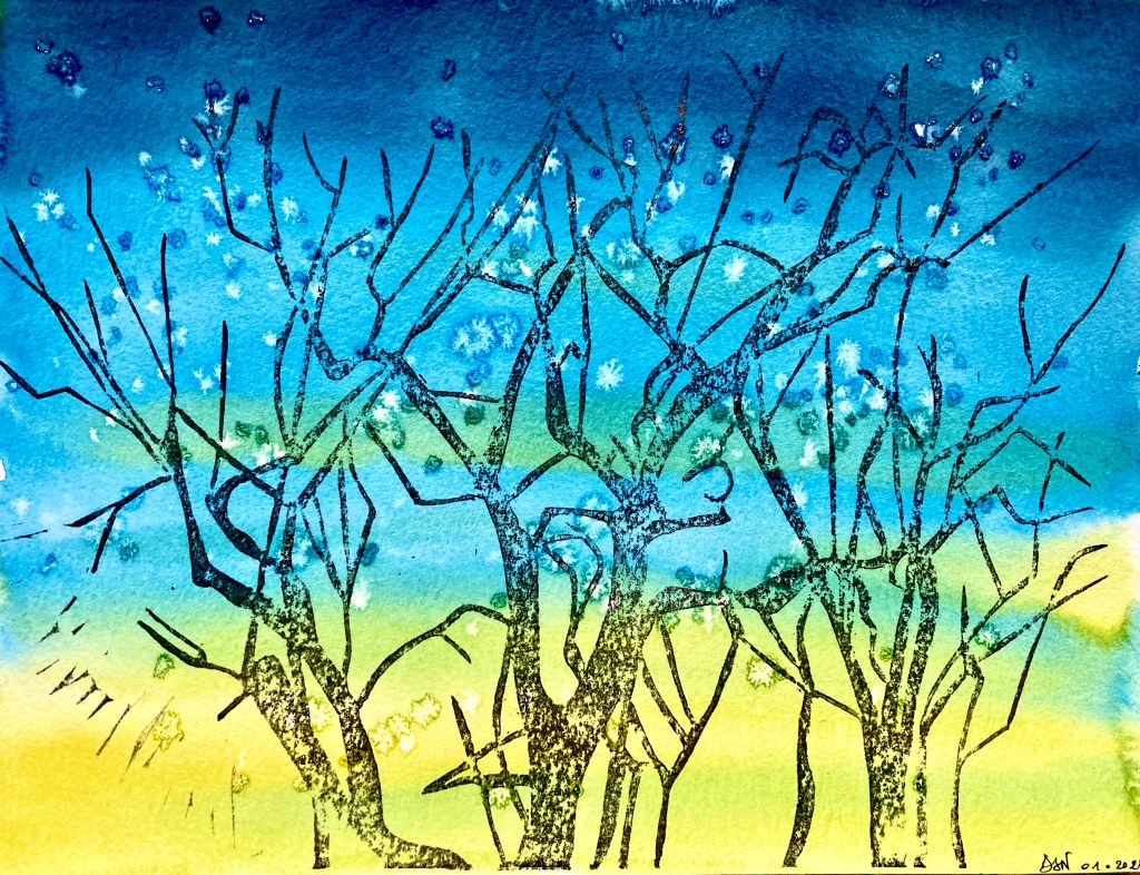 Voici mon amandier tel que je le vois depuis la fenêtre de ma chambre. En particulier, les couleurs matinales hivernales le dessinent magnifiquement. Spectacle vivant à lui seul, il fait aussi partie de la famille. Pour lui rendre hommage, double gravure car, ne pouvant choisir, j’ai fait deux épargnes différentes, comme une image et son négatif. En fonction de l’encre choisie, et de l’encrage du lino, l’arbre se transforme. Sur fond d’aquarelle, il devient herbe folle. Arbre aux multiples visages, aux multiples vies.