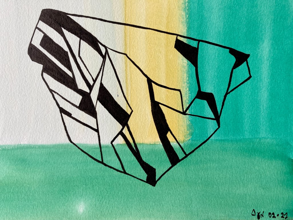 A force de regarder le gros caillou de l’Engadine (présenté dans l’article précédent), il s’est transformé ! Encore un beau projet Moln. Caillou magique ? Diamant géant ? Plateforme futuriste ? Cette forme fascinante, massive et puissante, est ainsi sortie de son contexte pour prendre vie de façon abstraite. Ce caillou, désormais en suspension, est ici resitué dans son environnement naturel évoqué par les masses de couleurs.