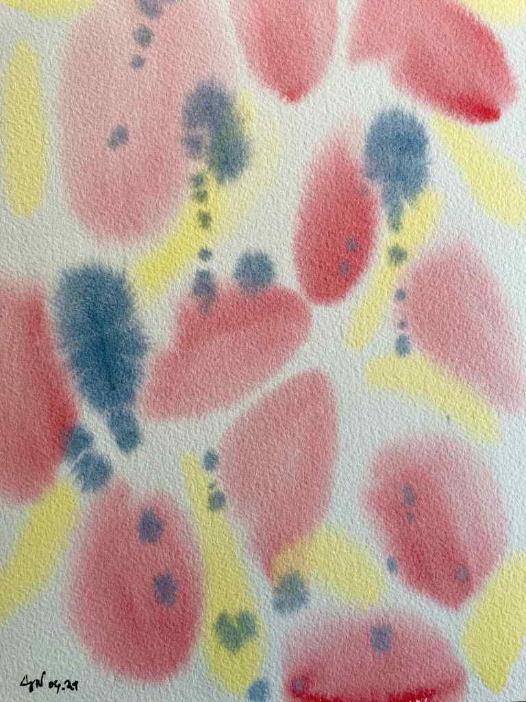 C’est la pleine saison des tulipes au jardin, comme un air de Hollande, à quelques mètres du pas de la porte. J’ai encore beaucoup à apprendre de la technique de l’aquarelle, mais j’aime cette composition expérimentale souple, sortie d’un jet créatif en quelques coups de pinceaux. La tulipe rouge s’est ici transformée, déformée, et dépigmentée au passage. Comme si un voile s’était déposé sur l’aquarelle, détrempée. Evocation ou quintessence ?