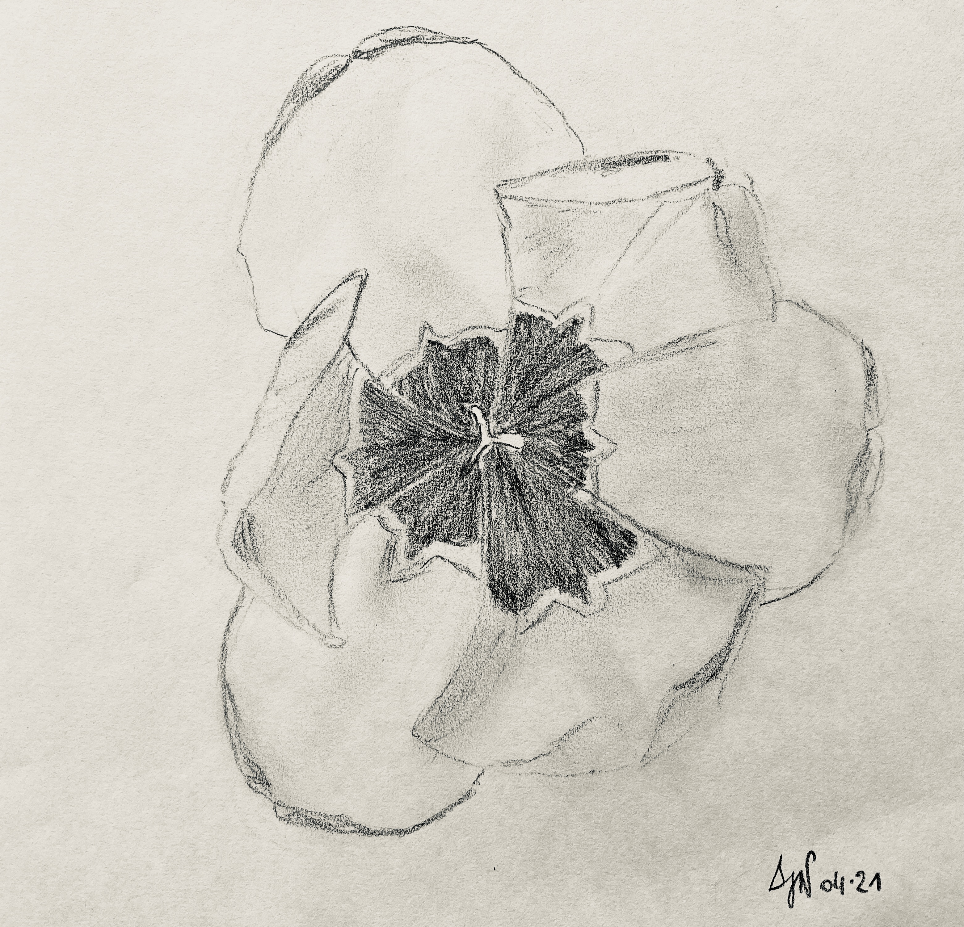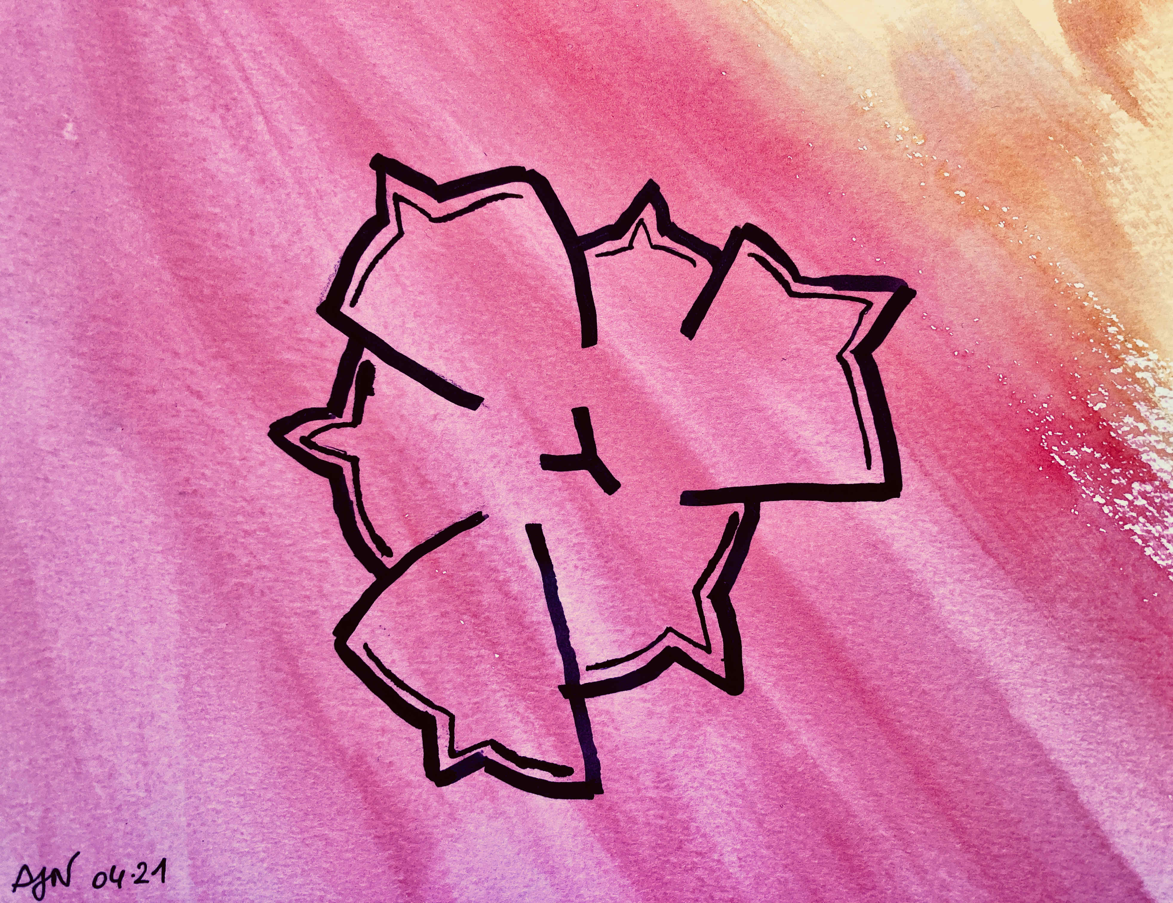 Cette tulipe m’a tourné la tête à force de la regarder pour la croquer ! Elle est devenue une forme géométrique, comme un labyrinthe. Elle vient rejoindre le gros caillou et l’ébouriffé dans leurs métamorphoses. J’ai voulu restituer au pinceau la délicatesse et la soie du pétale, et évoquer les couleurs de la fleur, principalement rouge, et jaune et noire à l’intérieur.