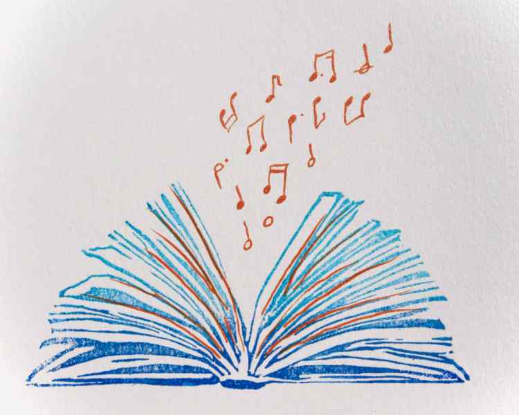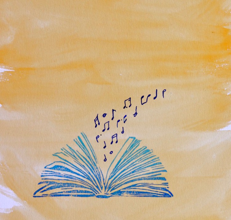 Une fois n’est pas coutume, ce projet n’est pas vraiment Moln, mais il m’a bien occupée ces derniers temps. Et il s’agit d’une composition originale. J’ai créé le visuel d’un projet que je vais mener l’année prochaine avec la médiathèque de Chilly-Mazarin (Essonne) : « Les mots mélodies », lectures musicales pour les 4-6 ans. J’ai voulu un message simple, qui parle aux petits et à leurs parents. Le livre chantant s’est vite imposé, restait à choisir la forme de ce qu’il en sortirait : une portée musicale ? Des notes ? Un texte ? J’ai dû respecter les contraintes du service Communication qui réalisera les affiches pour l’événement : un motif plutôt compact, centré sur la feuille, afin de pouvoir placer les mentions légales et informations pratiques de façon lisible. J’ai choisi la gravure pour que cette idée simple, pas très originale, soit colorée, ait une certaine douceur et une texture particulière, qui attire l’attention. Les notes sont peintes à la plume, avec de l’encre aquarelle (bleu) et de l’encre acrylique (orange). Après plusieurs tentatives de gravures, différents essais de couleurs, j’ai abouti à deux versions : l’une sur fond blanc, l’autre sur fond d’aquarelle orangée. J’ai hâte d’en voir le résultat complet !