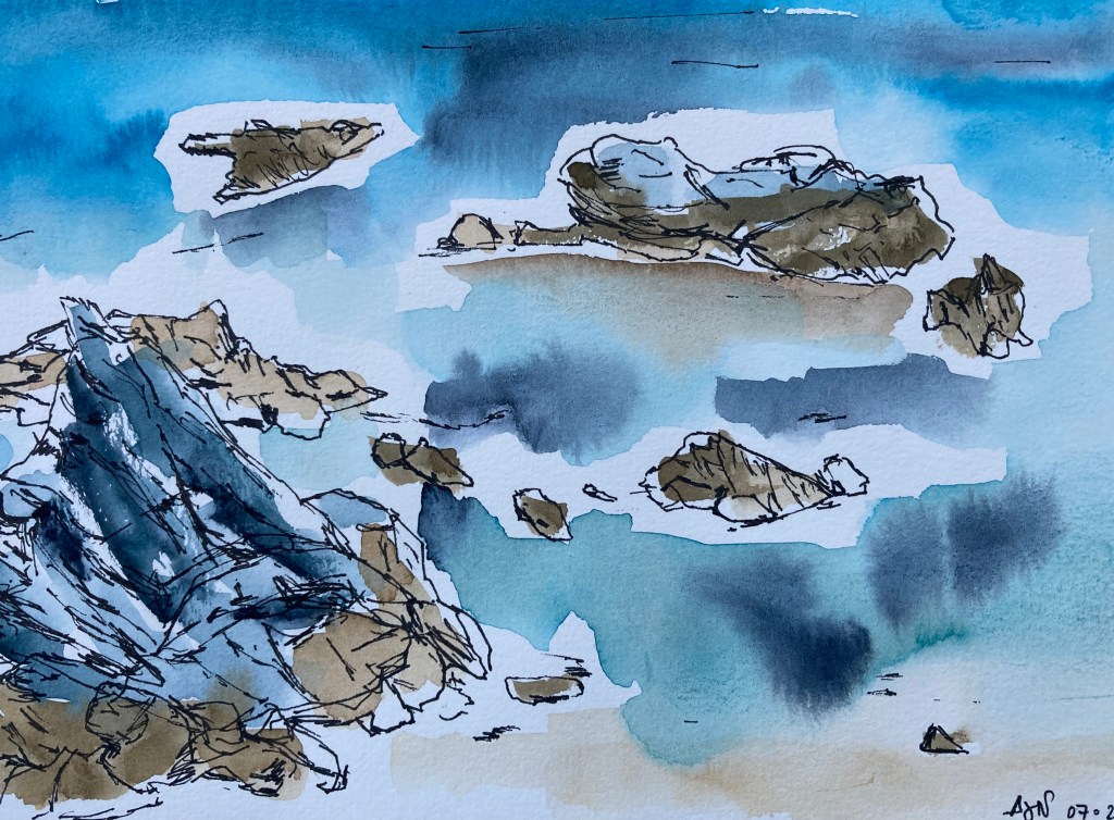 Nous y revoilà. Belle Ile en mer, côte sauvage. Une courte randonnée entre le village d’Anterre et la Pointe des Poulains m’a permis de reprendre mes marques et de savourer le plaisir des paysages retrouvés. J’ai peint ce petit format d’après une photo que j’ai prise dans la matinée. J’ai commencé par un dessin à l’encre, que j’ai ensuite colorisé à l’aquarelle. J’ai essayé de mettre du mouvement par les taches dans l’eau et les zones restées blanches, et le mélange de techniques apporte une texture douce et rugueuse à la fois. Quelle belle île !