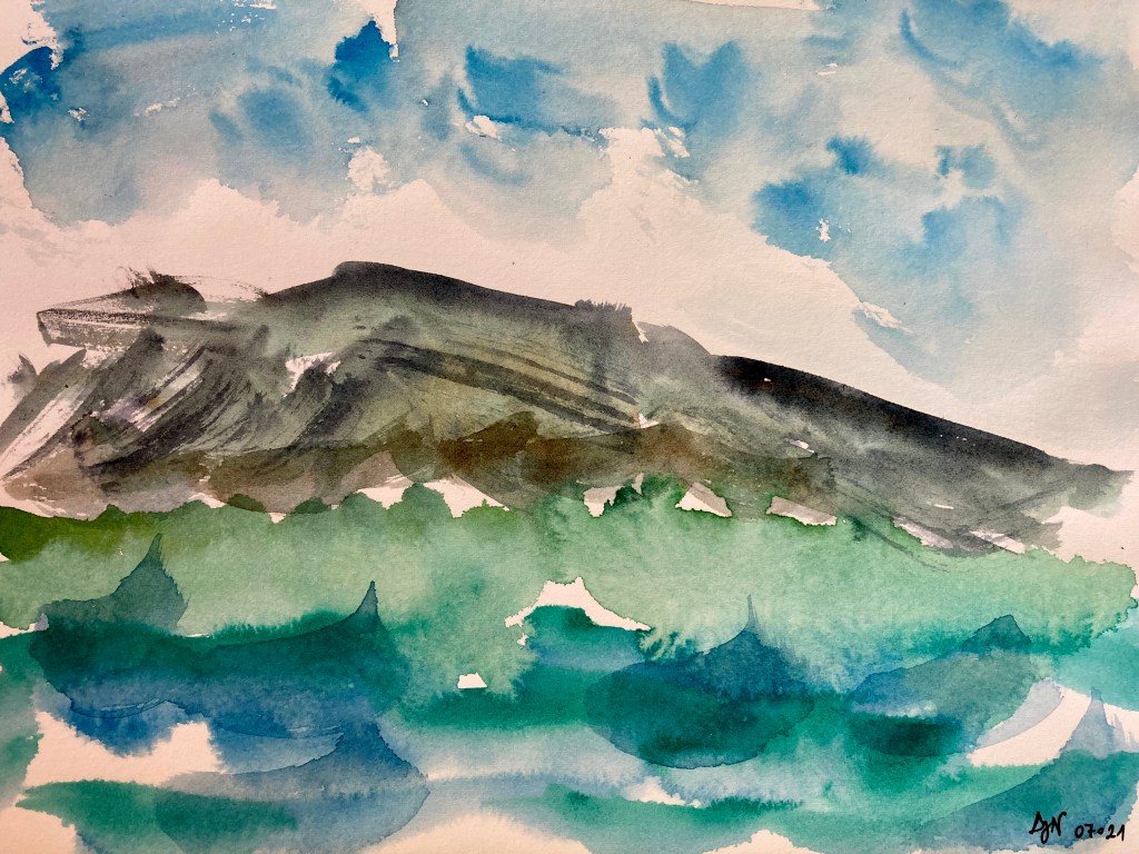 Inspiration du moment, improvisation en couleurs et mouvement. Aquarelle sur du joli papier, quelques mélanges colorés et élans de pinceaux, moment de détente à l’abri du soleil généreux.