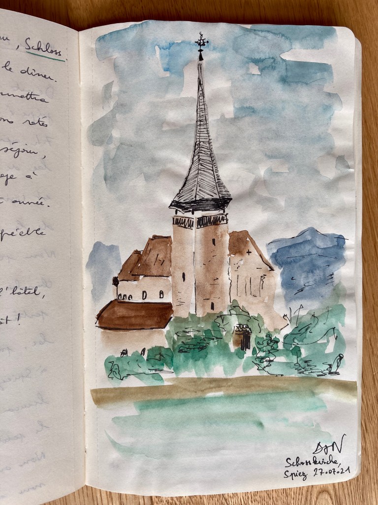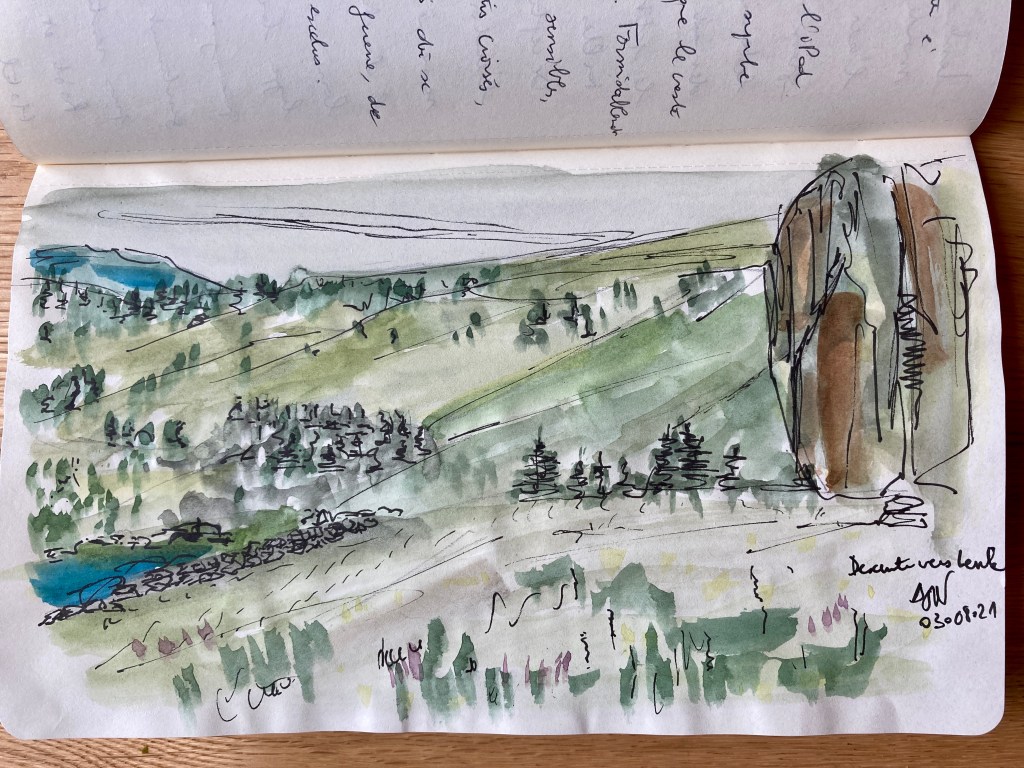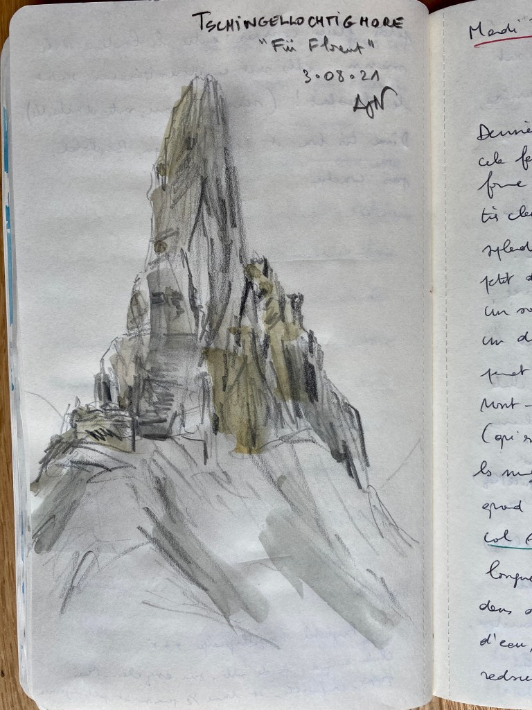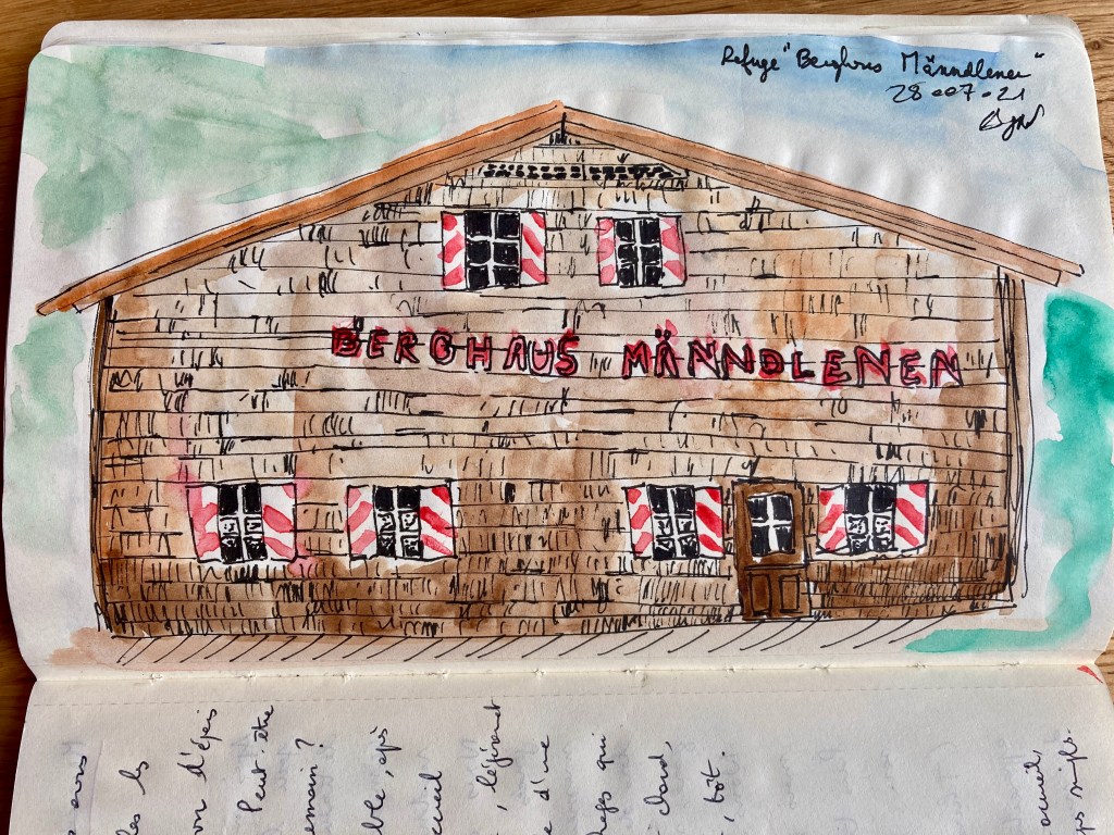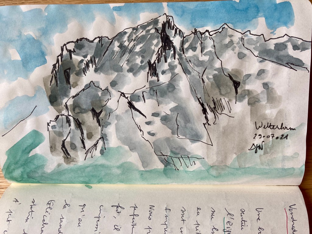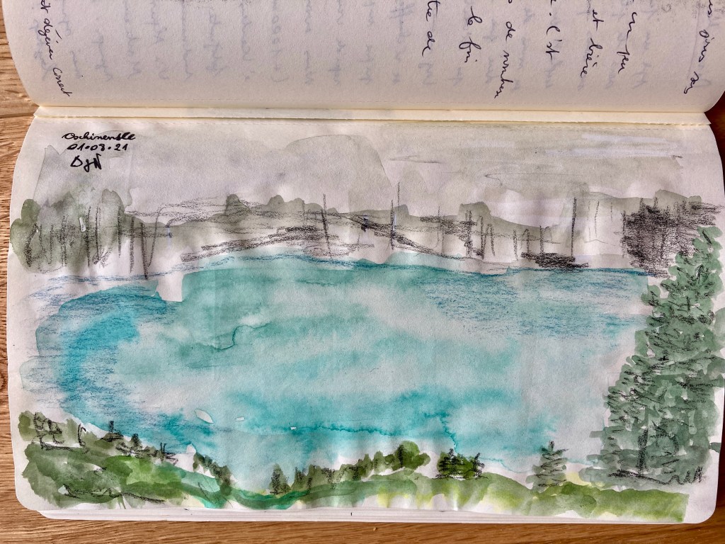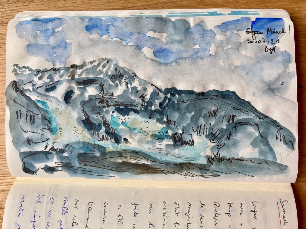 Huit jours de coupure et de recentrage dans les montagnes suisses. Marche, sport, temps étiré. À la rencontre de paysages étonnants, grandioses, charmants, lunaires, hostiles, accueillants. Où notre place dans le vaste monde vivant n’est plus centrale. Où tout semble si simplement essentiel. Je consigne dans un carnet de voyage les temps forts, découvertes, émerveillements, rencontres humaines, animales ou végétales, petits ou grands événements du quotidien, ainsi que les itinéraires empruntés chaque jour, cols et sommets. Et si j’en ai le temps, je dessine un croquis ou une aquarelle. Je pars, par nécessité, très légèrement équipée : un carnet Moleskine (21 x 13 cm), quelques crayons (graphite, pastel et pigment liner), un pinceau à réservoir d’eau, un stylo 4 couleurs, et un mini-coffret d’aquarelle. Le papier n’est pas vraiment adapté à l’eau, les pages ondulent, mais j’aime ce carnet compagnon de voyage. Je dessine soit sur site, soit d’après photo, en fonction du temps (que j’ai et qu’il fait !). Voici donc ces pages dessinées, avec leur spontanéité, leurs couleurs, leurs élans plus ou moins réussis. Quel beau souvenir lorsqu’il s’agit de s’y replonger pour à nouveau voyager.