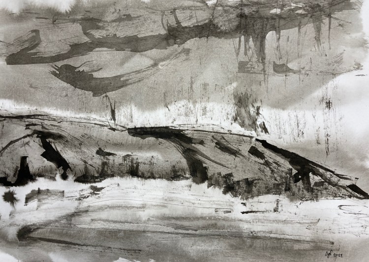 Le temps passe vite depuis l’été. Le rythme du quotidien n’est hélas pas toujours compatible avec celui de Moln, qui prend son temps. Mais depuis la rentrée, je prends des cours de dessin, il était temps, justement. Mon objectif est de toucher à tout, et de dessiner sous contrainte afin de progresser dans ma pratique, en me confrontant à des plus grands formats, en approfondissant des techniques connues, et en en découvrant d’autres. J’ai ainsi pu expérimenter la technique du lavis, avec de l’encre de Chine. Cela m’a fascinée. Après quelques essais divers, d’après des photos, avec des natures mortes, je saisis vite l’importance du geste, et je recherche mon style avec un certain appétit. Je m’évade complètement. Alors je mobilise mes souvenirs : ceux de la falaise au-dessus de la plage de Donnant, que je vais voir tous les jours lorsque je suis à Belle-Ile. J’en ai une image assez précise, concentrée, personnelle, et bien présente. Et cela me suffit pour me lancer. Je suis fière de mon premier lavis et de cette interprétation hors du temps.