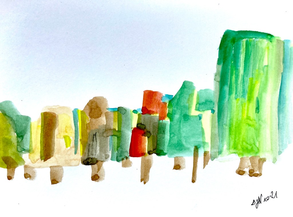 Dans le parc, il y a des arbres et des couleurs. Voici les arbres, puis leurs couleurs. Les gourmands de mon entourage m’ont fait remarquer qu’on dirait des esquimaux glacés. Sortes d’arbres friandises. En voici la recette : dessiner rapidement une aquarelle avec quelques touches de feutre, puis en extraire le jus des couleurs. S’est posée alors la question des formes. Schématiser ? Arrondir ? Etirer ? Mélanger ? Superposer ? J’aimerais développer cette démarche d’extraction de la couleur, en approfondissant la recherche des formes finales. Encore un projet Moln intéressant en perspective, mais de grande ampleur. En aurai-je simplement le temps ? Ce n’est pas que je n’aime pas les esquimaux, mais je pense qu’il y a de quoi explorer, et peut-être faire autrement.