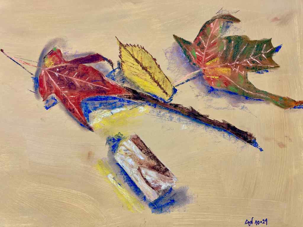 Voici le résultat d’un exercice de composition proposé par ma prof de dessin : réaliser une nature morte, puis la dessiner et la peindre, en respectant les jeux d’ombres de l’éclairage ambiant. Et bien, la tâche était ardue. J’ai d’abord réalisé ce pastel grand format dans lequel j’ai glissé un morceau de pain. J’ai essayé de placer les ombres, avec des contrastes mais pas trop, cela n’a rien d’évident, j’ai dû beaucoup plisser les yeux ! L’idée de faire une partie des ombres en bleu m’est venue tardivement, lorsque je tournais un peu en rond pour finaliser ces ombres, d’ailleurs pas toutes exactes. Enfin, j’ai estompé au minimum afin de d’exprimer la rugosité et la texture du pain, des feuilles, du bois.