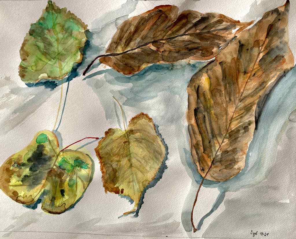 Rappel de l’exercice présenté précédemment : réaliser une nature morte, puis la dessiner et la peindre, en respectant les jeux d’ombres de l’éclairage ambiant. Après le pastel (présenté dans l’article précédent), j’ai composé une seconde nature morte et j’ai peint une aquarelle. Le jeu des ombres, encore une fois, n’était pas facile à réaliser. Elles sont là, parfois interprétées mais je suis contente du contraste obtenu. Finalement, j’ai comme donné une seconde vie à ces feuilles mortes, en leur apportant un petit quelque-chose de vivant et d’éternel maintenant.