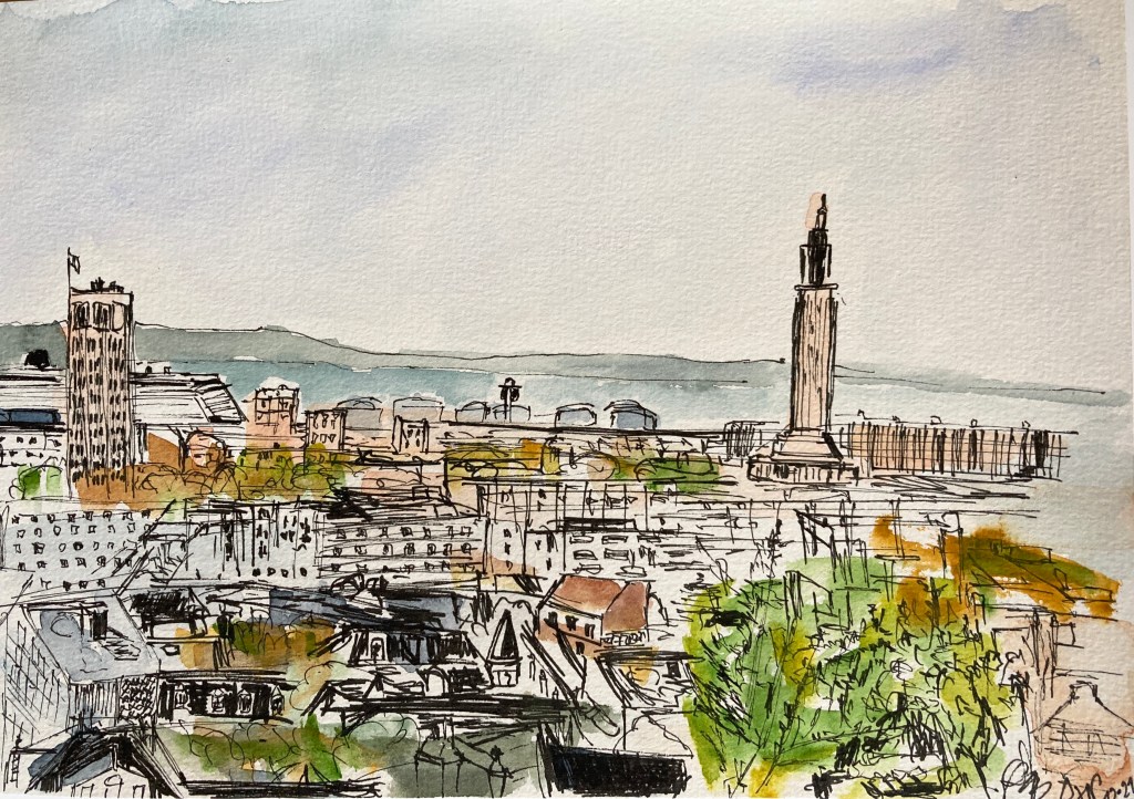 Quelle belle ville, dans laquelle je me suis tout de suite sentie bien. J’ai eu la chance d’y passer quelques jours fin octobre et ce croquis aquarellé attendait depuis d’être terminé. Je suis ravie de reprendre le chemin de Moln avec le souvenir de cette ville vallonnée où l’art, l’architecture, l’industrie, la mer, et les porte-containers se côtoient sans snobisme ni chichi.