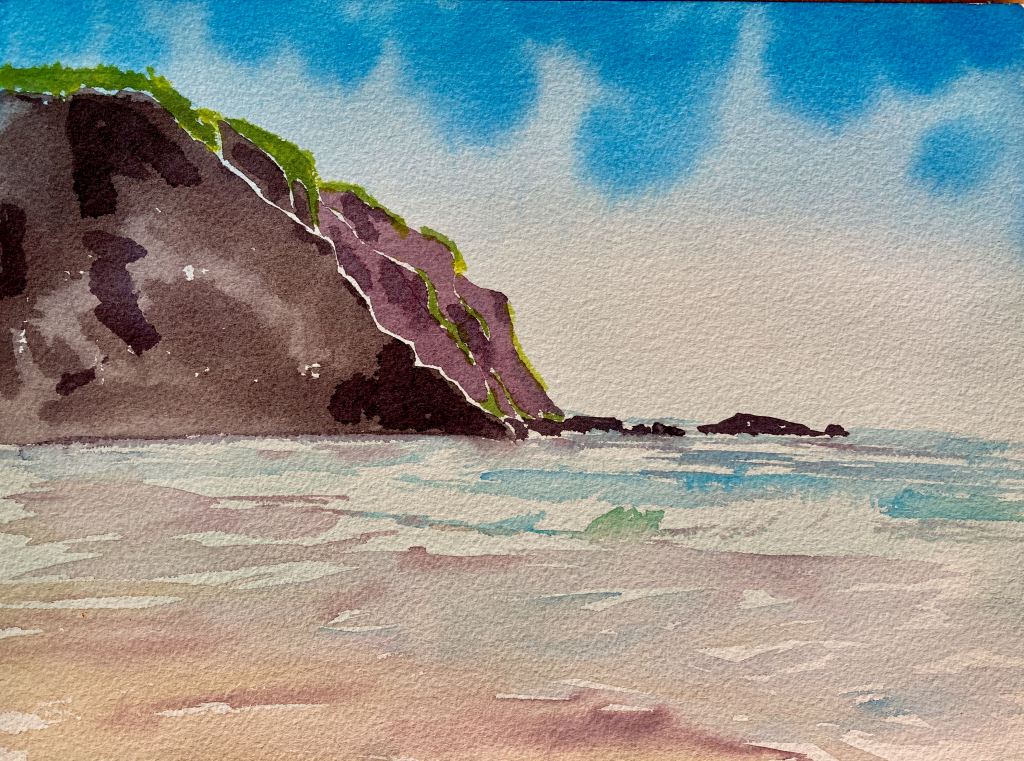 J’ai fait un stage d’aquarelle pendant tout un weekend, mi-mars, avec l’association D’un atelier à l’autre, à Ivry (https://www.dunatelieralautre.org). J’ai beaucoup appris, pratiqué, essayé, échoué, et réussi, le dimanche en fin de journée, il était temps, cette falaise. A partir d’une photo, j’ai peint avec 5 couleurs, mélangées entre elles, plus ou moins, avec différentes quantités d’eau. Il s’agit d’une interprétation colorée de la réalité, ne respectant pas forcément les règles de l’art en matière de logique des couleurs, mais cette composition fonctionne, j’en suis ravie. En particulier, j’aime l’évocation de l’agitation de la mer, et c’était d’ailleurs très agréable de la peindre. J’ai adoré cette immersion intensive dans le monde de l’aquarelle d’atelier.
