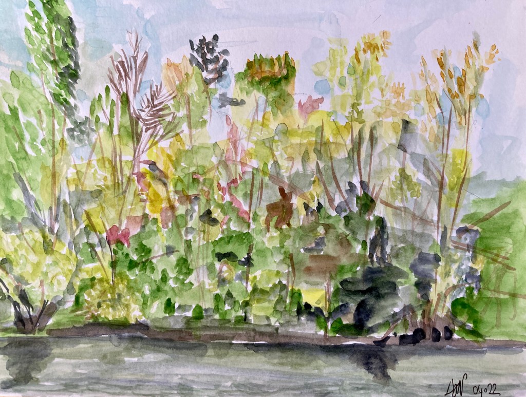 Même si ce samedi, pour moi, ressemble aux autres, une ambiance de vacances et de détente est bien là, printanière, c’est le week-end de Pâques. Pour y croire encore plus, je décide de m’accorder un après-midi de dessin, pas si souvent dans la routine quotidienne. Je rejoins deux amies morsaintoises et nous nous posons au parc du château, face au grand lac. Un paysage que je connais parfaitement, mais les arbres du rivages sont un sujet inépuisable et mes marges de progression sont importantes. Voici une aquarelle réalisée dans mon carnet de dessin dédié à Morsang, que j’ai terminé justement aujourd’hui ! J’ai essayé de soigner les ombres et lumières, leçon retenue de mes cours de peinture.