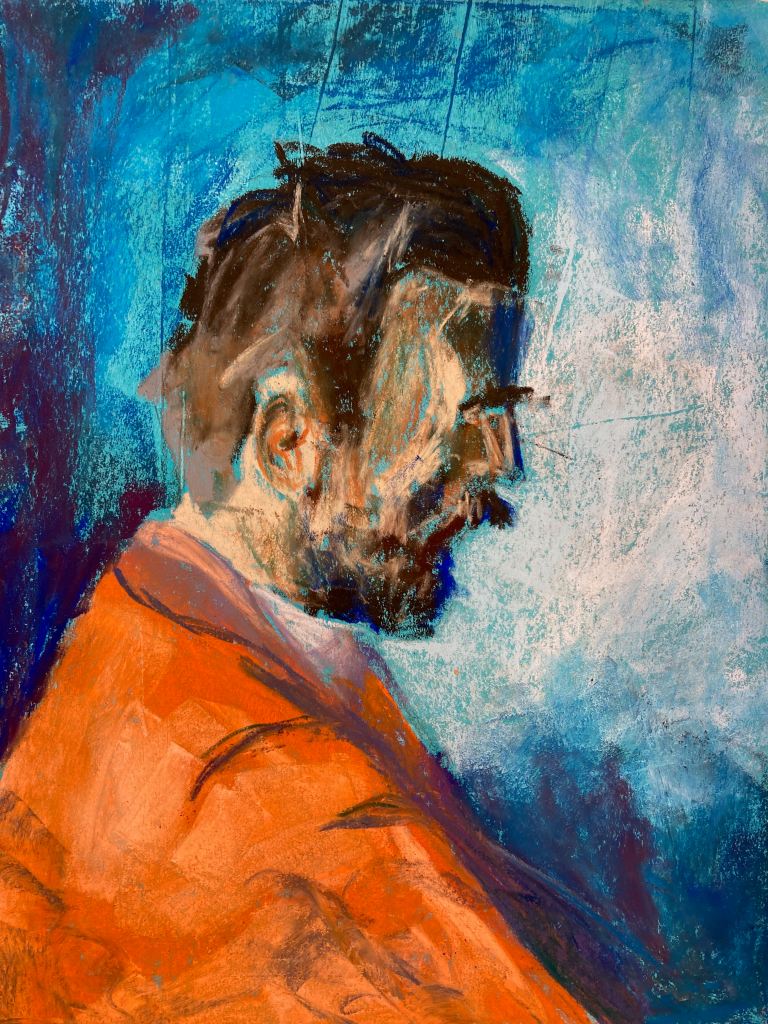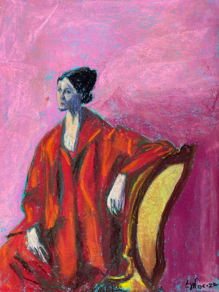 Un des derniers exercices de l’année : coloriser des oeuvres à partir de photocopies en noir et blanc. Il s’agit donc d’un travail de composition des couleurs. Je choisis de réaliser deux portraits peints par Picasso, que je ne connaissais pas : un homme, et Olga. Première étape : le dessin, la reproduction du modèle. Deuxième étape : le choix des couleurs, liberté totale ! Troisième étape : la peinture au pastel sec et la mise en valeur des ombres, sur papier préparé à la gouache. Cet exercice est parfait pour progresser, mêlant interprétation personnelle et cadre donné par la consigne. En cette fin d’année, après quelques mois de pratique régulière, et de conseils avisés de ma prof Albertine, je sens que j’ai gagné en aisance, que je commence à acquérir certains réflexes. Même s’il ne s’agit pas de mon rapport à la nature, mon projet Moln est bien servi, à travers regard, liberté et geste pictural.