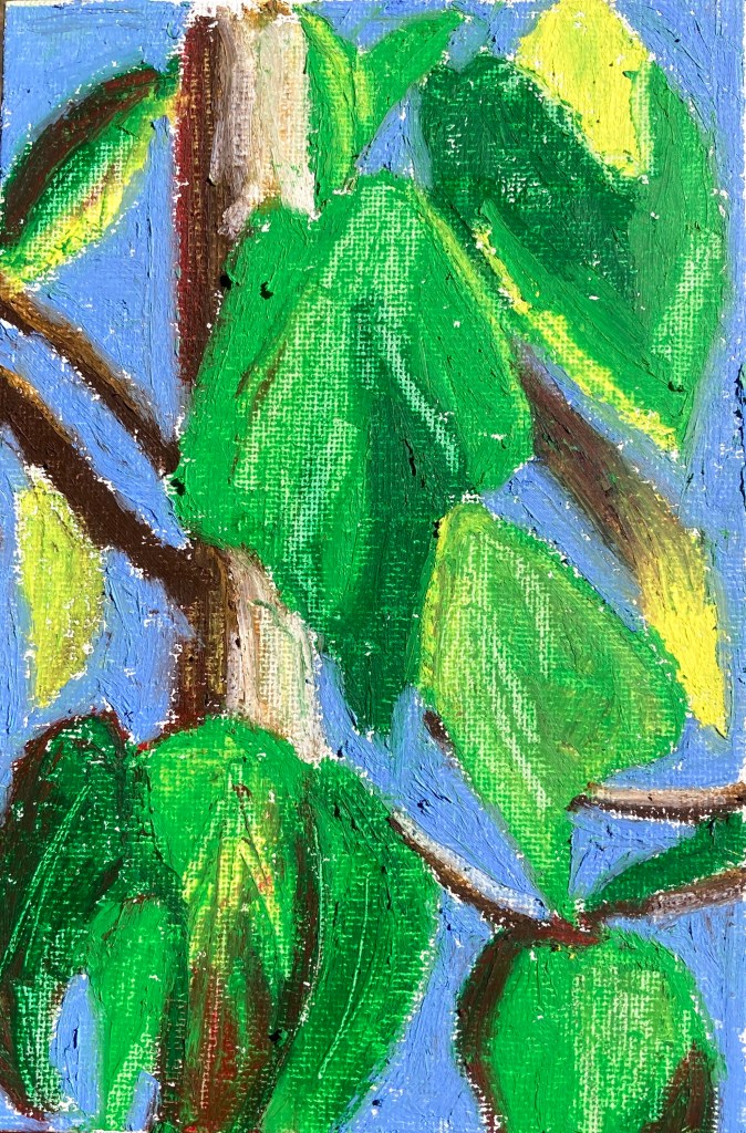 C’est une première : une peinture sur toile. Petit format, certes, et technique que je ne connais pas bien encore, mais pour laquelle j’ai une certaine intuition : le pastel gras. Donc tout est nouveau ou presque, et je me satisfais de cela, d’autant que je me pose au jardin, sur la terrasse, à quelques mètres de mon arbre déjà grand. J’en fais une composition inspirée du port de ses feuilles, caractéristique. J’utilise un couteau pour râcler le pastel par endroits, pour des effets de textures et de lumière. Les jeux d’ombres sont permanents, et changeants en fonction du soleil. Cette peinture a été réalisée sur fond de doux sons mêlés : calme d’un dimanche de juillet, vent dans les feuilles, et cris de joie d’enfants jouant dans un jardin voisin.