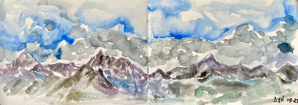 Tentative de panorama d’après photo, et pas n’importe lequel : l’enchaînement des sommets voisins du Matterhorn de plus de 4000 m (Dent blanche/ Zinalrothorn / Weisshorn). J’ai peint sur la double page d’un petit carnet très agréable (papier épais adapté à l’aquarelle), et je n’ai pas voulu rajouter d’encre pour garder la douceur de la seule peinture. Mais je trouve tout cela bien confus. Je pense que le petit format rajoute à la difficulté. Et je ne suis pas allée assez dans le détail de l’aquarelle. Enfin, je vois bien que le ciel prend trop de place par rapport aux montagnes. Mais c’est un bon point d’étape : voilà où j’en suis aujourd’hui. Cet axe de travail d’un panorama me stimule !