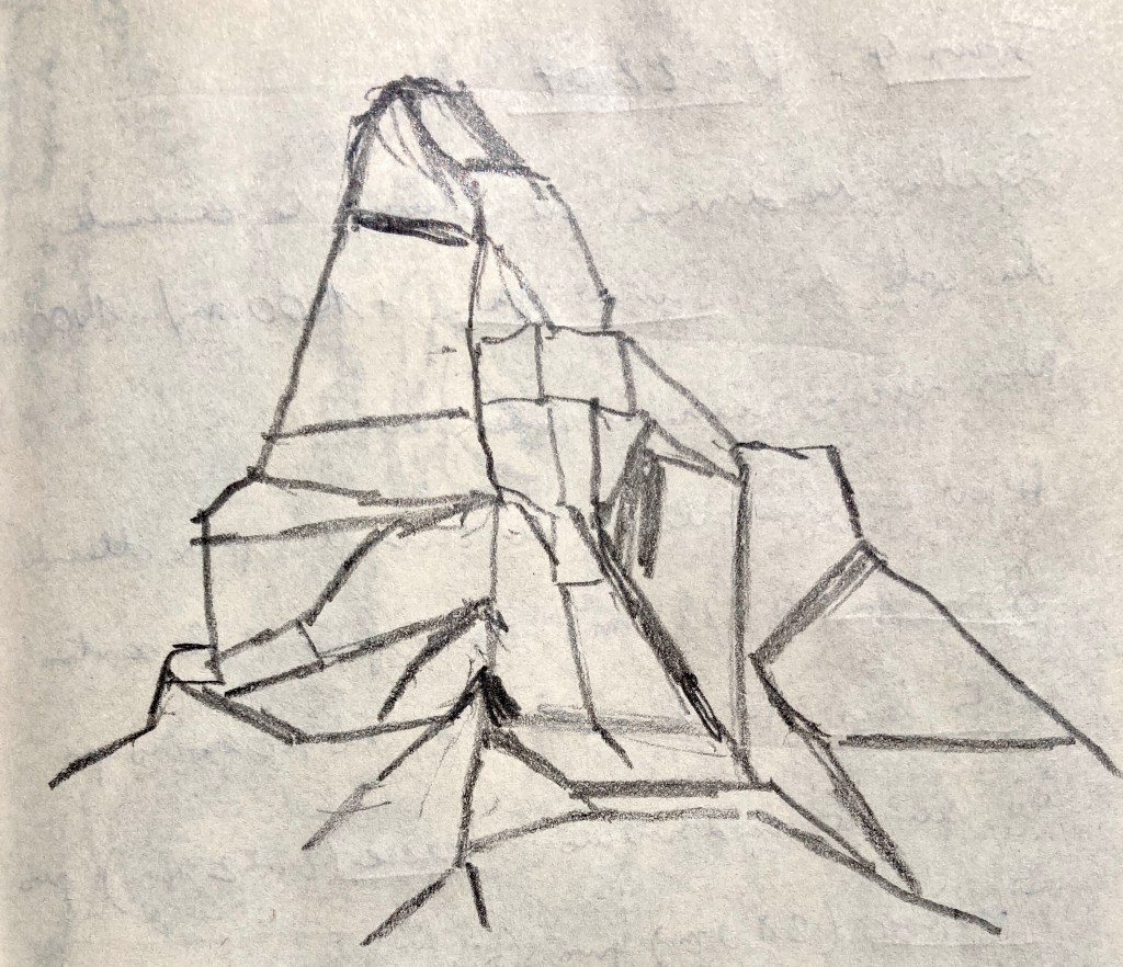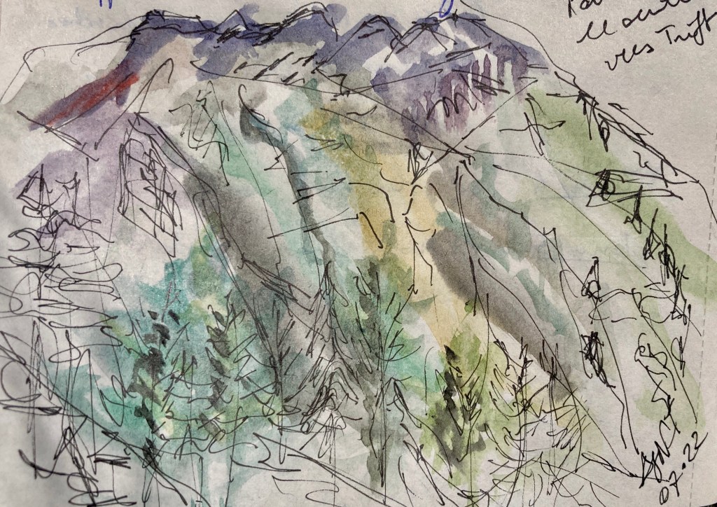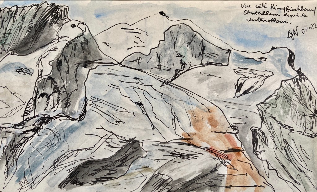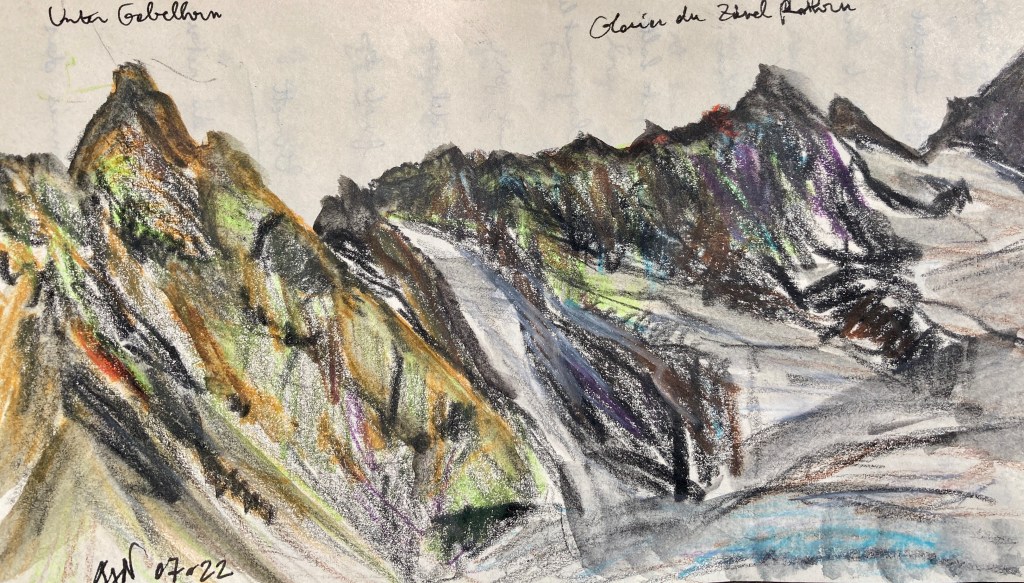 Fin des vacances à Zermatt. Mon carnet de voyage est vivant et bien rempli : temps forts, étapes des randonnées, pensées légères ou réflexions plus durables, étonnements, et bien sûr, quelques croquis, pastels et aquarelles au fil de l’eau. C’est de cela qu’il s’agit ici : les ambiances des lieux croisés sont très variées, tout comme l’ont été les journées de ces formidables vacances.