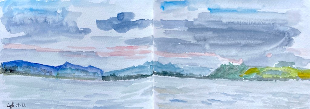 Ultime étape de ce séjour Suisse, le lac de Neuchâtel offre quelques surprises qui valent ce petit détour : un panorama imprenable sur les Alpes de l’Oberland au Mont-Blanc, déjà très prisée à la Belle Époque, un relief très escarpé permettant de prendre de la hauteur, une eau claire et clémente invitant à s’y baigner, une vue sur le Jura proche, et de nombreux sentiers de randonnée à portée de bus ou de train. Voici une aquarelle matinale, la dernière des vacances, réalisée dans le calme de la ville qui se réveille.