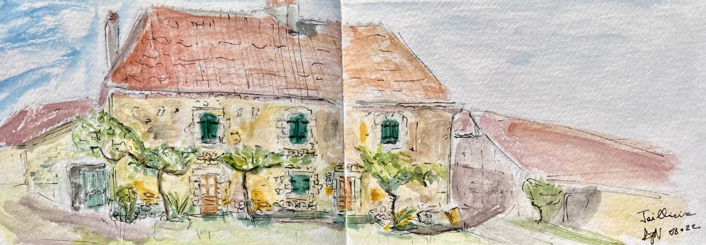 Quelque jours caniculaires en Dordogne, chez nos amis Philippe et Géraldine. Le temps calme de l’après-midi a été propice au dessin, abritée à l’ombre du grand noyer. J’ai dessiné avec minutie leur maison, puis ai peint cette aquarelle sur la double page de mon petit carnet. Pour finir, quelques traits au pigment liner. Je suis heureuse de ce souvenir artistique du lieu et des bons moments passés.