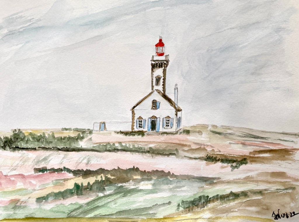 Travail d’atelier à la maison d’après photo, alors qu’avec une bonne partie de la troupe, nous dessinons en chœur sur la table de la cuisine. Moment agréable et inattendu, plein de concentration, de créativité et de bonne humeur. Je choisis un sujet classique mais auquel je ne m’étais jamais confrontée, un symbole de Belle-Ile : le phare des Poulains. Avec le recul, je me dis que j’aurais pu m’autoriser un peu plus de fantaisie mais je n’ai pas l’habitude de ce genre de sujet, je me sens moins libre. Je garde cela dans un coin, peut-être y reviendrai-je d’une autre manière plus tard.