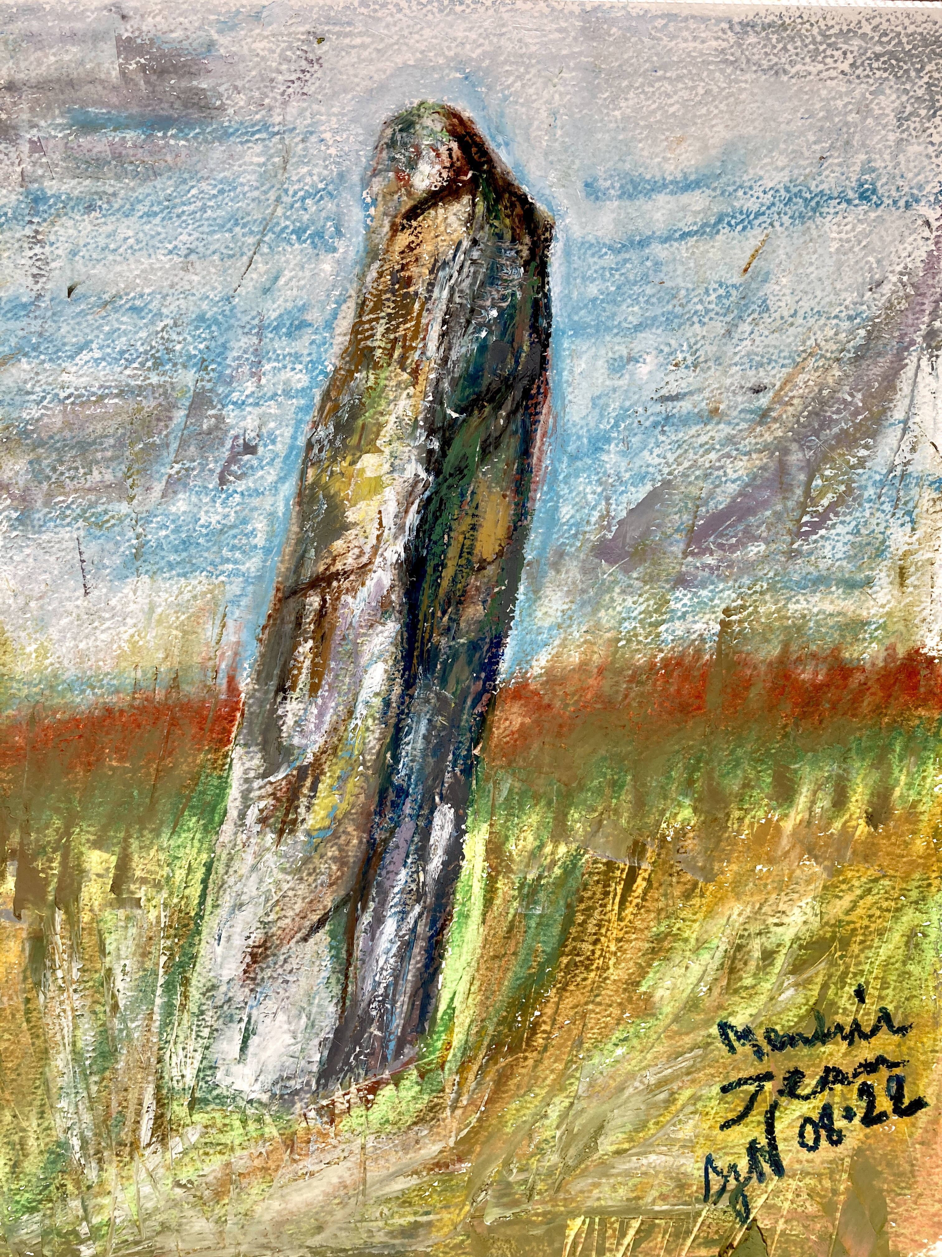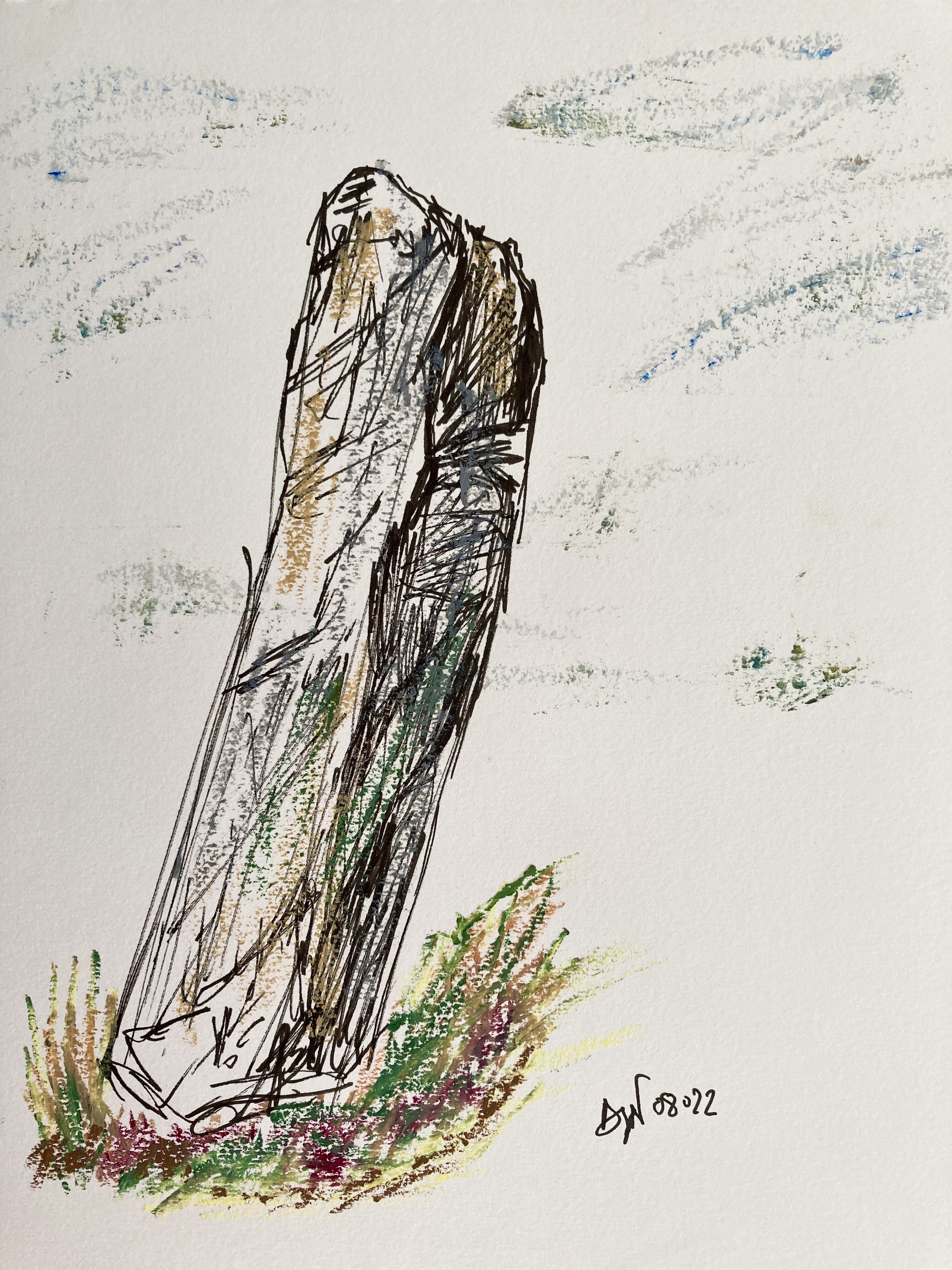 A Belle-Ile, c’est là qu’il faut tourner pour rejoindre le village d’Anterre, au niveau du menhir Jean. Je l’ai pris en photo et le dessine de retour à la maison : d’abord un croquis afin de me familiariser avec ses formes et proportions. Puis un grand format au pastel gras, pour lequel je mélange largement les couleurs, sur un fond gris. Quelques ajouts finaux au blanc et quelques coups de couteaux permettent de rendre la texture de la pierre. Mais une fois le menhir posé sur le papier, je dois le situer dans un contexte, un cadre ; l’exercice est plus difficile encore que de peindre le menhir lui-même ! J’ai essayé de ne pas perdre le sujet principal dans son environnement, pas si simple. Les deux autres peintures sont faites plus rapidement et grossièrement mais je suis contente de la variété des rendus : un menhir schématique au pigment liner relevé de quelques touches de couleurs au pastel gras, et une aquarelle plus abstraite, le menhir se tenant bien droit, et le trait de couleur évoque la pierre malgré la fluidité de la peinture.
