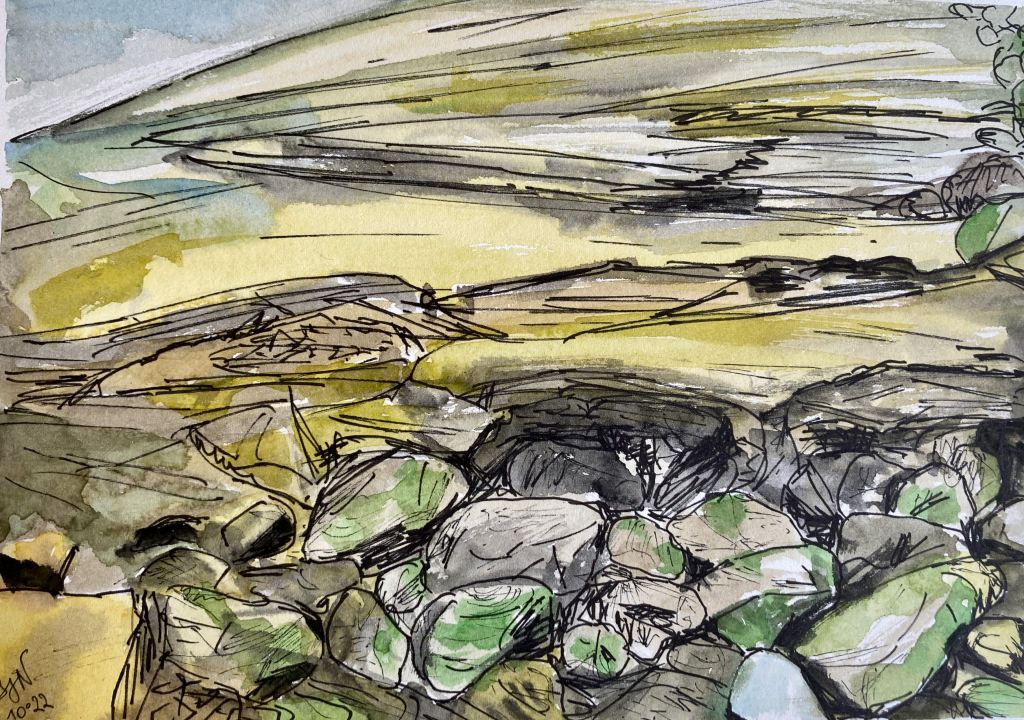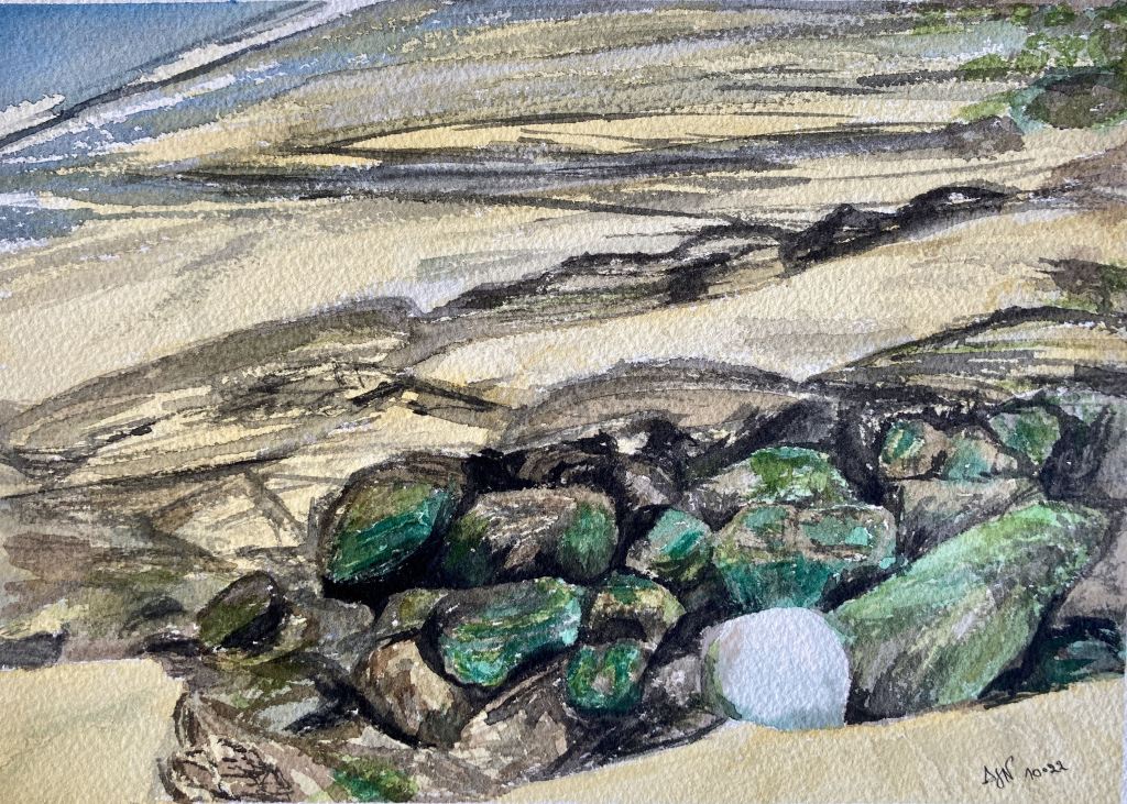 Encore une destination qui me fait rêver : l’Ecosse. Je la visite pour l’instant par procuration, d’après les récits et photos d’amis. Le dépaysement par le paysage est une sensation unique et particulière, qui inspire à la fois l’humilité et la force. Mon amie Isabelle revient justement d’Ecosse, émerveillée. Alors pour son anniversaire, j’ai récupéré en cachette quelques photos et j’ai choisi de peindre cette côte étonnante, aux gros galets verts creusés dans le sable, posés comme des oeufs géants. La nature y est puissante, et l’atmosphère y semble limpide et rafraîchissante. Ce que j’aime dans ce paysage de Saint-Kilda, c’est évidemment le contraste entre les arrondis du premier plan et les lignes du second plan. J’ai réalisé 2 aquarelles de ce site, chacune racontant ce lieu à sa façon. La première (« trait tonique »), réalisée sur papier satiné, est très graphique. Elle m’évoque une planche de bande dessinée. La seconde (« trait calme »), peinte sur papier torchon, est plus classique, et plus minutieuse. Les galets sont apparus en creusant les ombres progressivement. J’y suis revenue à plusieurs reprises, en laissant reposer mes yeux, en ajoutant petit à petit des touches de noir, de vert, de jaune, et en travaillant le second plan. En fin de compte, chaque composition réconcilie les géologies différentes de ce site, unies par un même trait de peinture.