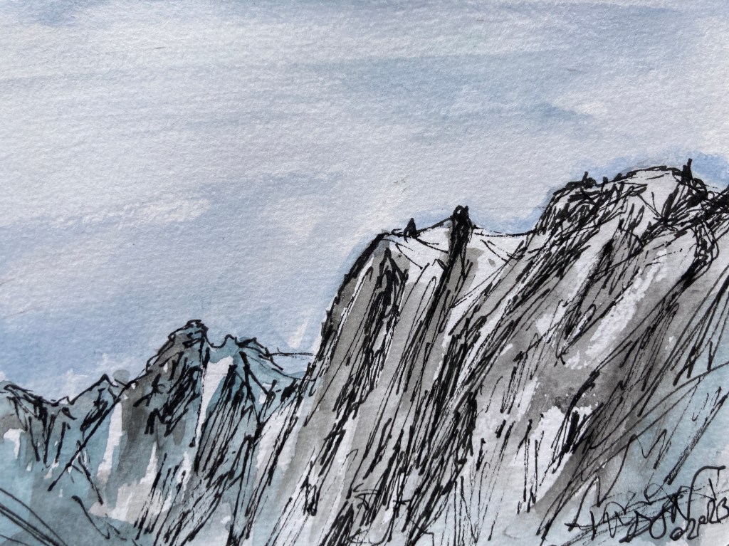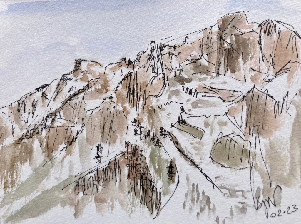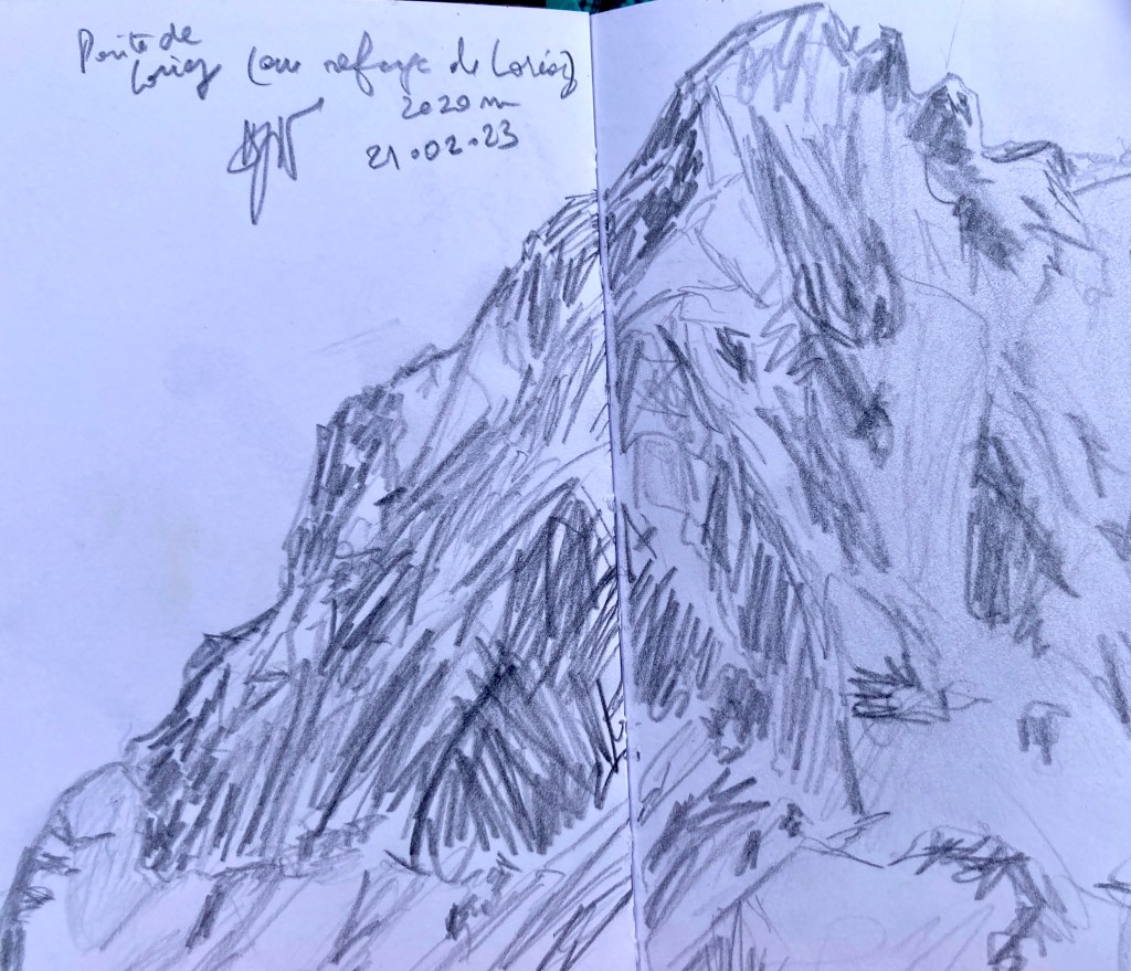 Vacances d’hiver réinventées depuis quelques années, et vacances réussies ! Nous sommes à pied, à quelques kilomètres du centre de Chamonix, dans un petit chalet. Plus proche de la nature, en pratiquant la randonnée hivernale plutôt que le ski de piste, je prends beaucoup de plaisir dans ce ralentissement. Le lieu est touristique, à juste titre ; ce site majestueux et chargé d’histoire de l’alpinisme est légendaire. Mais notre activité sportive nous éloigne du monde. Je dessine tous les jours, soit en croquant sur le vif, soit de retour de randonnée, sur la terrasse du chalet idéalement exposée face à l’Aiguille du Midi et au Mont-Blanc. C’est l’occasion de décortiquer les ombres et lumières, les reliefs et les proportions des montagnes. Un sujet que je n’estime pas maîtriser encore mais que j’apprécie d’étudier sans lassitude. Je me cherche encore en la matière … Il faudra revenir !
