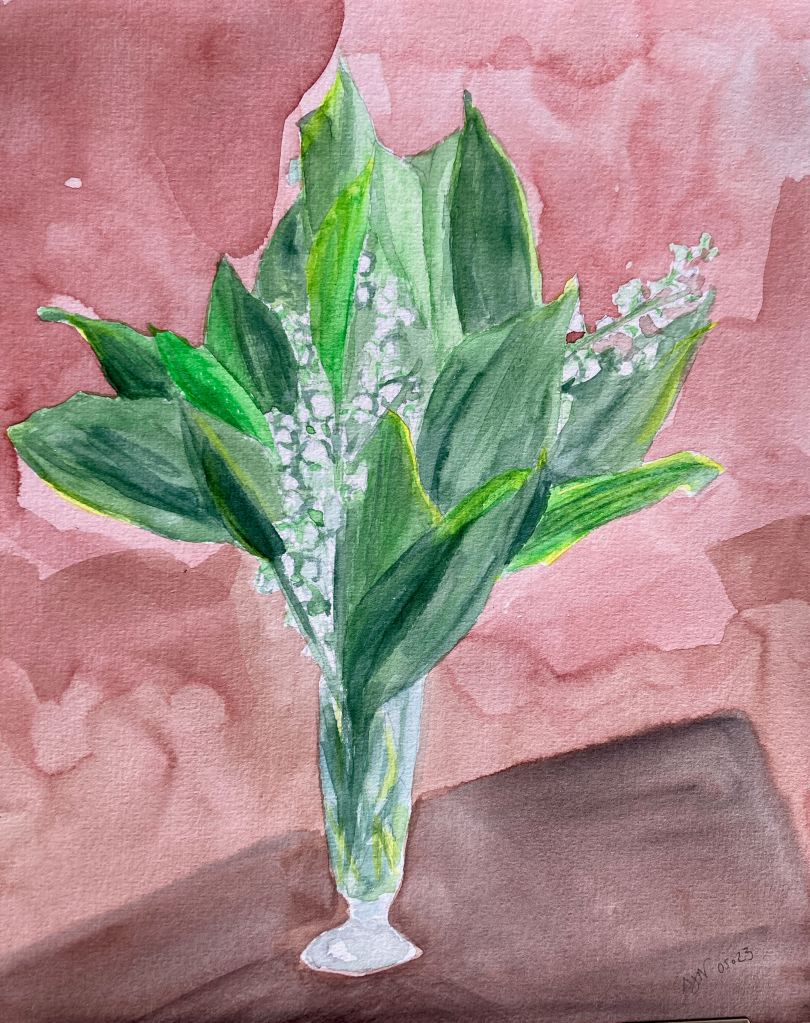 Fille de mai, j’aime le muguet. J’ai peint mon bouquet des vacances. D’abord, d’une façon réaliste (Muguet, bouquet dans son vase), en n’oubliant pas de créer un fond cohérent dans la composition globale de cette nature morte. Je me suis inspirée de la couleur des murs du salon et en ai fait une interprétation libre. Les couleurs utilisées constituaient d’ailleurs un point d’attention : je me suis limitée à 3 couleurs principalement (vert, jaune pour l’éclaircir et faire les nuances de verts, et rouge pour le foncer et faire d’autres nuances) auxquelles j’ai ajouté un peu de gris et de bleu, pour la table et l’eau du vase. Je suis contente du résultat mais me suis un peu ennuyée à peindre, ce côté minutieux ayant été un peu fastidieux. En revanche, la deuxième aquarelle (Muguet, bouquet dansant) repose beaucoup plus sur le geste : peinte dans un élan rapide, en quelques minutes, avec un gros pinceau, j’ai choisi de mettre en valeur le feuillage ; seules 3 couleurs ont été utilisées (vert, jaune, rouge) avec des mélanges de différentes intensités (de couleurs et d’eau). J’ai aimé créer tous ces tons de verts, et former ce ballet de feuilles, qui me semblent vraiment en mouvement. Les clochettes sont peintes au pinceau fin, en transparence, et sont plus évoquées que dessinées. Je trouve cette aquarelle plus vivante que la précédente, avec du caractère, même si elle est moins composée et académique.
