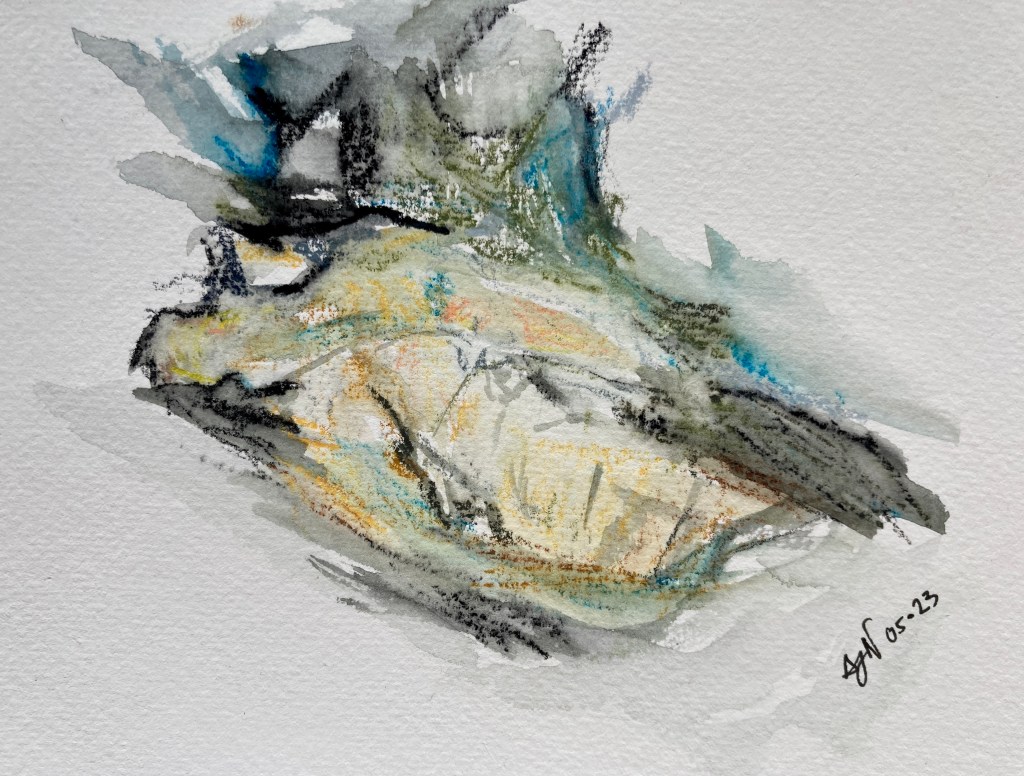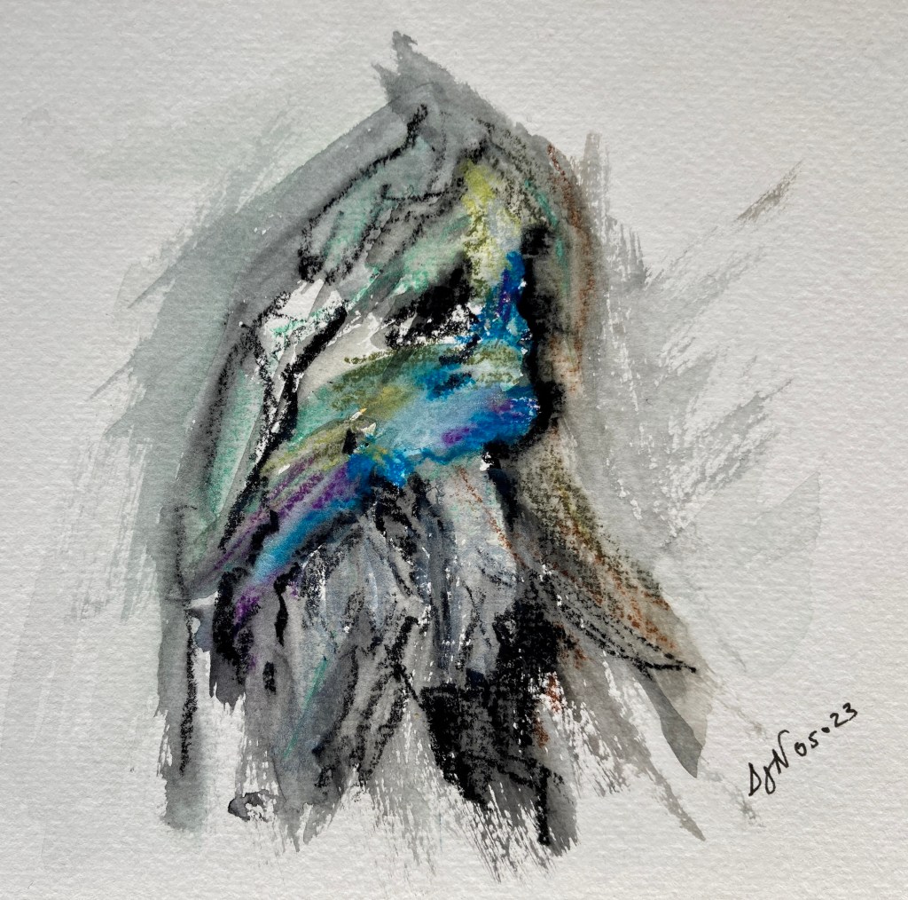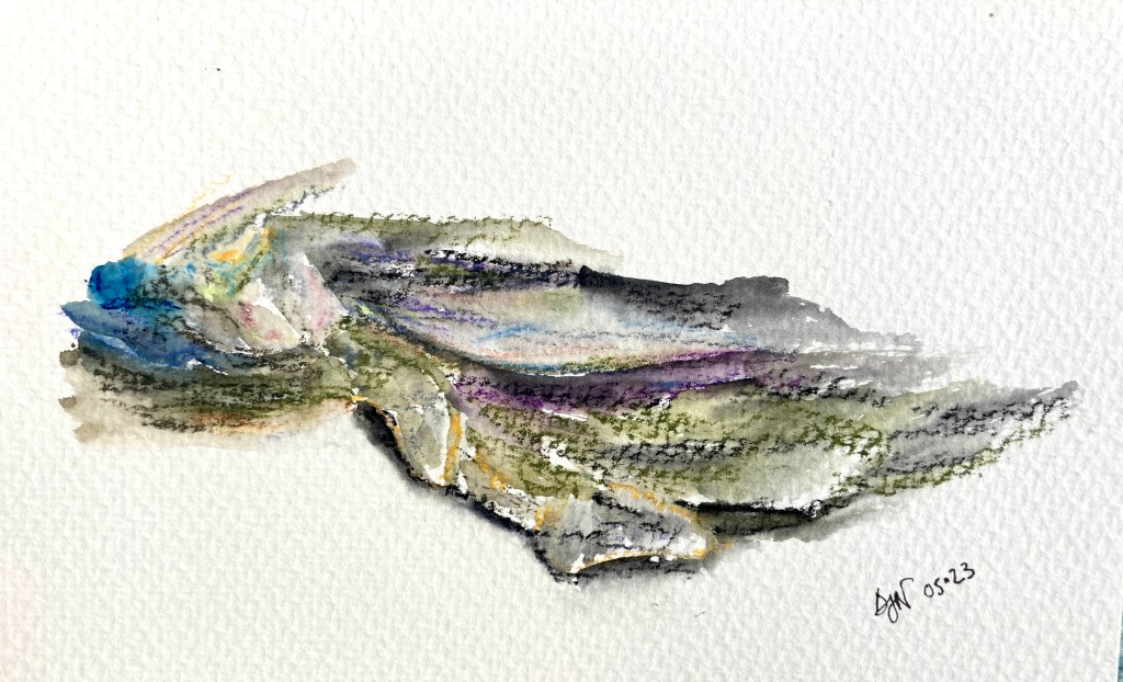Encore une idée. Celle de peindre de façon contemporaine les détails des roches. Voici 4 aquarelles réalisées à partir de roches de bord de mer, à Belle-Ile. Certaines sur le vif, d’autres de retour à la maison d’après photos. Des essais de matières, de couleurs, plus ou moins imprégnés d’eau, à la craie grasse aquarellable Neocolor2, sur petits formats. J’aimerais réaliser une série cohérente, plus aboutie, mais je suis contente d’avoir entamé ce travail artistique.