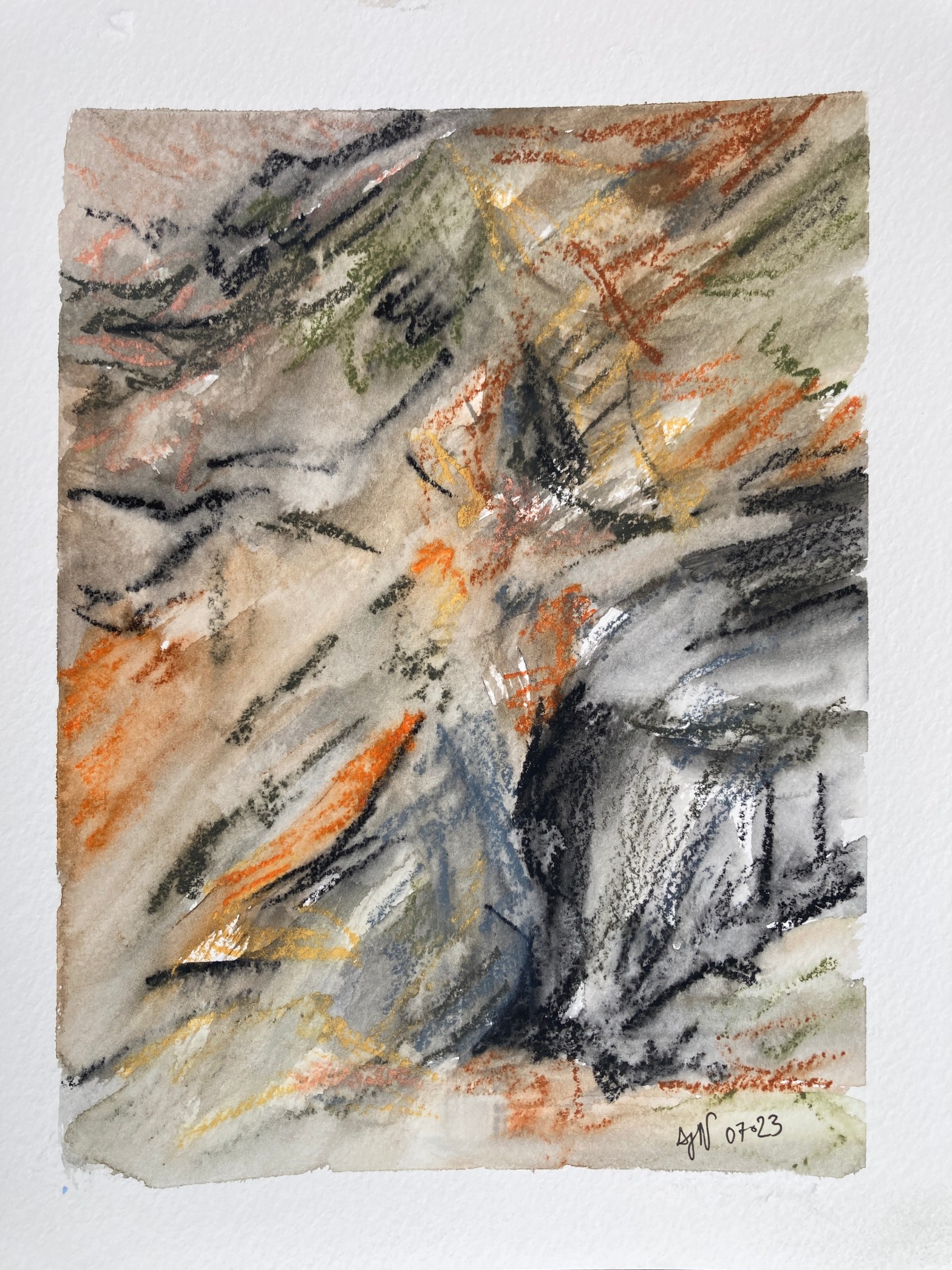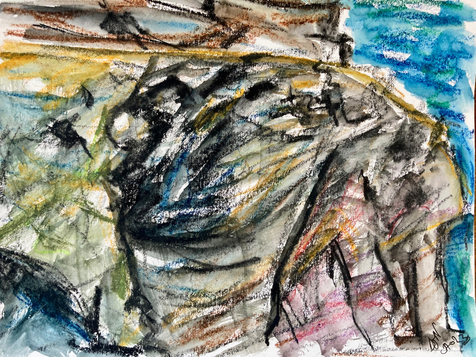 Temps pluvieux, propice au travail d’atelier. La journée est consacrée à l’expression libre : je peins avec mes craies grasses aquarellables une falaise et une roche de bord de mer. Il s’agit de deux interprétations pour lesquelles je privilégie le geste, que ce soit dans les traits ou dans les coups de pinceaux. Je suisLire la suite « Caillou liberté »