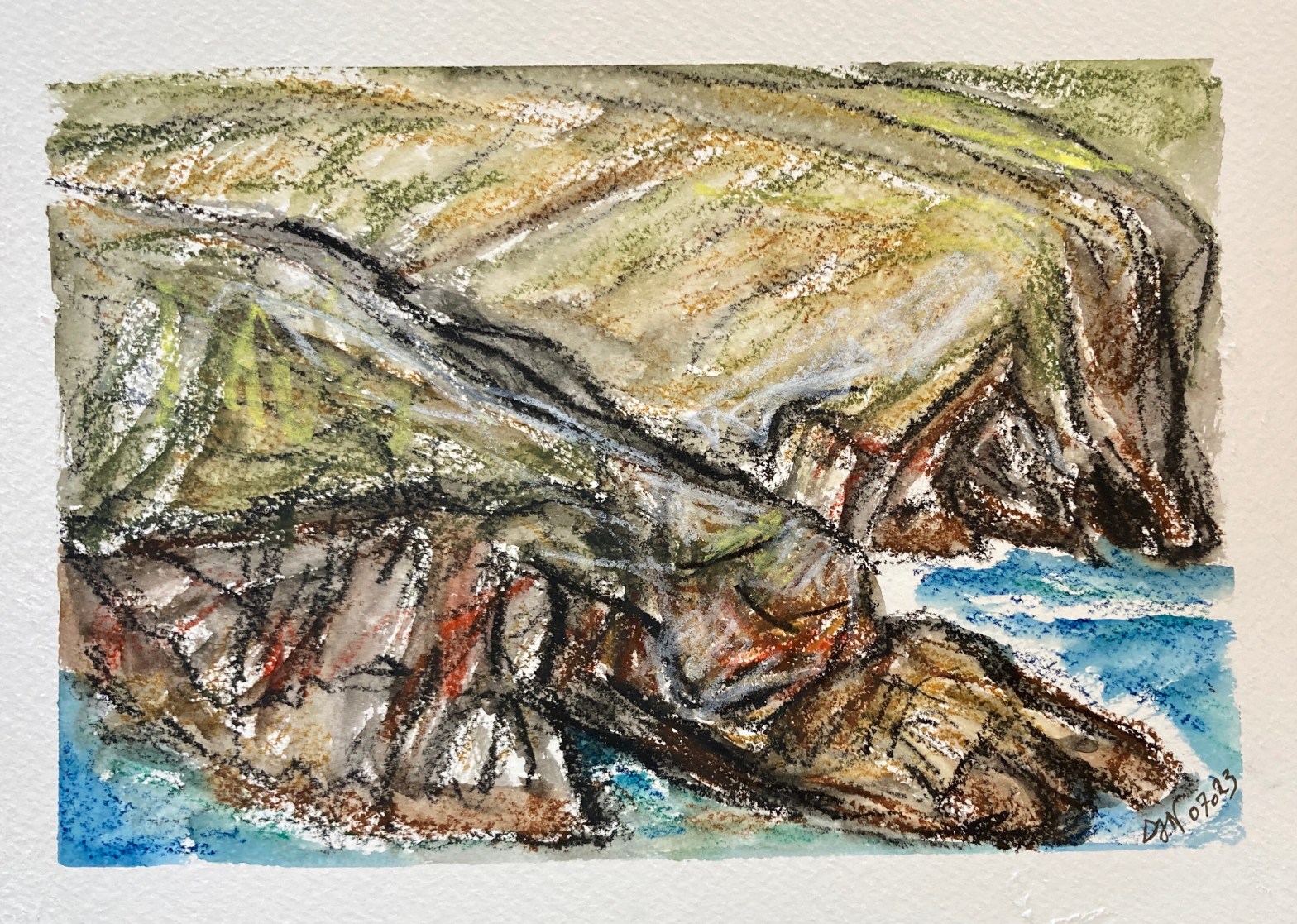 Au gré des randonnées. Sur le vif pour la première falaise et interrompue par la pluie, que j’ai dû la finaliser rapidement ! J’ai choisi cette falaise qui me faisait penser à un pied de géant, non loin de Port Goulphar. J’avais préparé le contour à l’avance sur ma feuille, souhaitant faire un « grandLire la suite « Sur les sentiers côtiers »