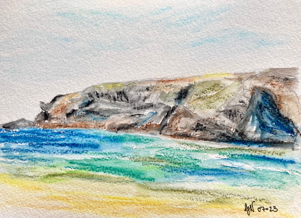 Ce titre, c’est pour changer de Belle-Ile. Ar Gerveur, c’est son nom breton. Donc nous y revoilà. Ouf. Bouffée d’air et de beauté, loin de mon environnement quotidien, même si ici tout m’est familier aussi. Nous fréquentons Donnant, mais avec un autre point de vue. La falaise n’est pas la même. J’utilise les craies grasses aquarellables (Neocolor2) pour faire une petit croquis aquarellé acidulé. La liberté.