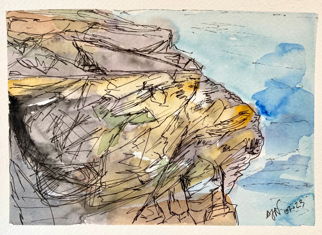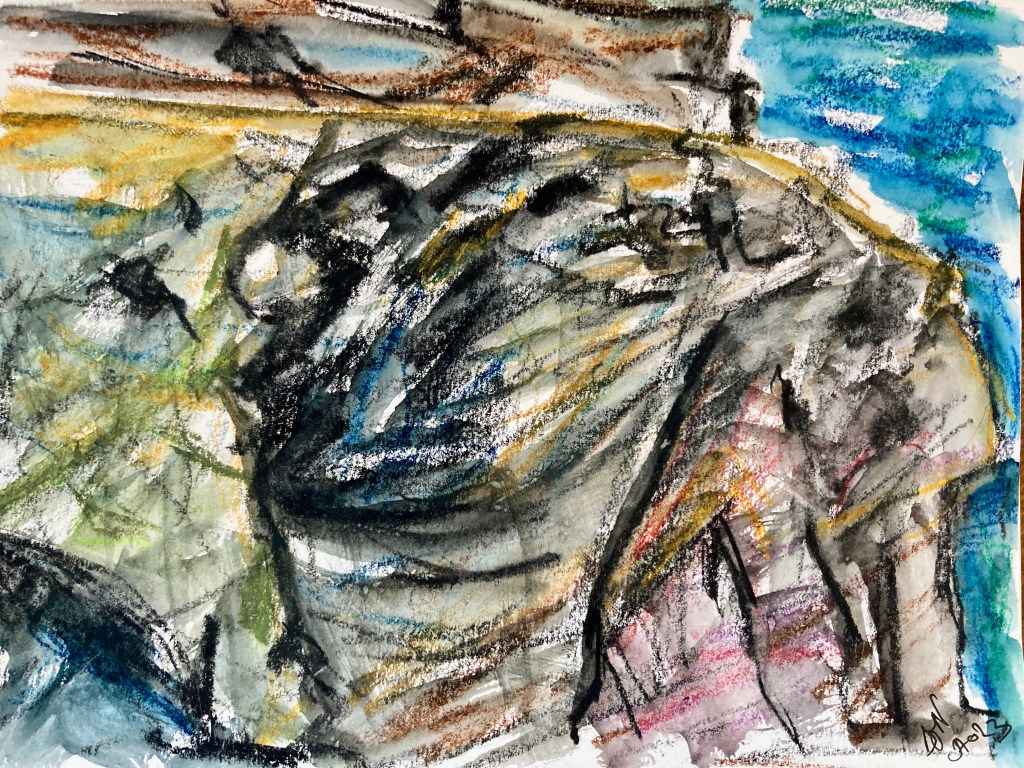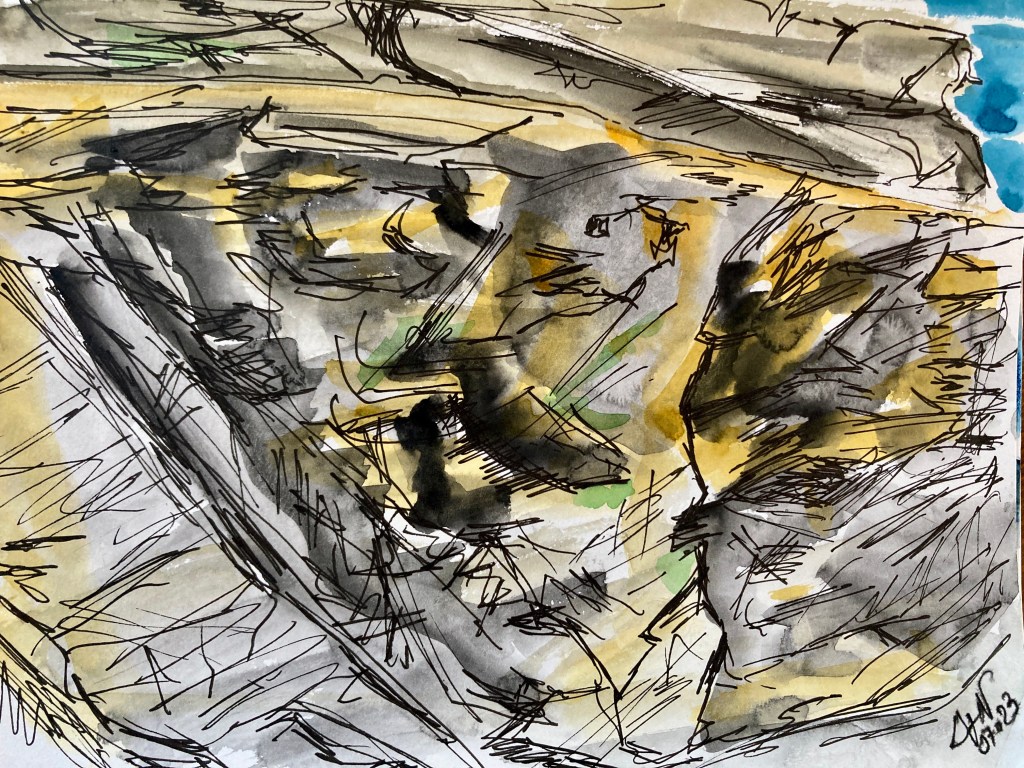 Fin d’après-midi venteuse et ensoleillée, petite promenade vers Donnant pour trouver un endroit où dessiner. Je me pose au-dessus de la jolie crique de Port Scheul, face à une belle falaise de la côte sauvage. Plutôt qu’un sujet réaliste, je prends cette falaise comme prétexte à peindre et dessiner de la roche. En effet, je ne souhaite pas faire forcément quelque chose de fidèle, proportionné, réaliste : je m’intéresse à la texture, aux orientations de la roche. Pour ces 3 versions, je cherche à faire quelque-chose de contemporain, en insistant sur le geste, en zoomant sur une petite partie seulement de la falaise. La première aquarelle est faite sur un beau papier, format moyen, avec beaucoup d’eau, au gros pinceau. La deuxième a été faite pendant le séchage de la première, en mode croquis aquarellé, sur petit format, rapidement, avec quelques traits de couleurs. Sur ces 2 peintures, je rajoute des traits avec un nouveau feutre fin d’encre de Chine que je trouve très agréable (le Pitt artist pen de FaberlCastell). La troisième, sur petit format également, à la craie grasse aquarellable (Neocolor 2), avec quelques couleurs plutôt vives, est un dessin de mémoire après une observation schématique du relief. Il y a une progression dans le côté abstrait : je n’aurais pas pu faire la deuxième aquarelle sans la concentration sur la première version, et sans en « évacuer » les proportions et le réalisme. Et la troisième est libérée de toute contrainte réaliste, chemin tracé par la deuxième aquarelle. Cette dernière version est d’ailleurs ma préférée, elle nous emmène ailleurs, dans une autre réalité. J’aimerais me lancer dans les grands formats avec cette approche.