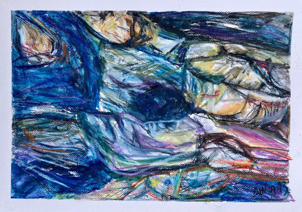 Temps pluvieux, propice au travail d’atelier. La journée est consacrée à l’expression libre : je peins avec mes craies grasses aquarellables une falaise et une roche de bord de mer. Il s’agit de deux interprétations pour lesquelles je privilégie le geste, que ce soit dans les traits ou dans les coups de pinceaux. Je suis contente du résultat contemporain de ces 2 ambiances aux tons et aux teintes bien différents. Je teste, je patouille, je gribouille, je me défoule.