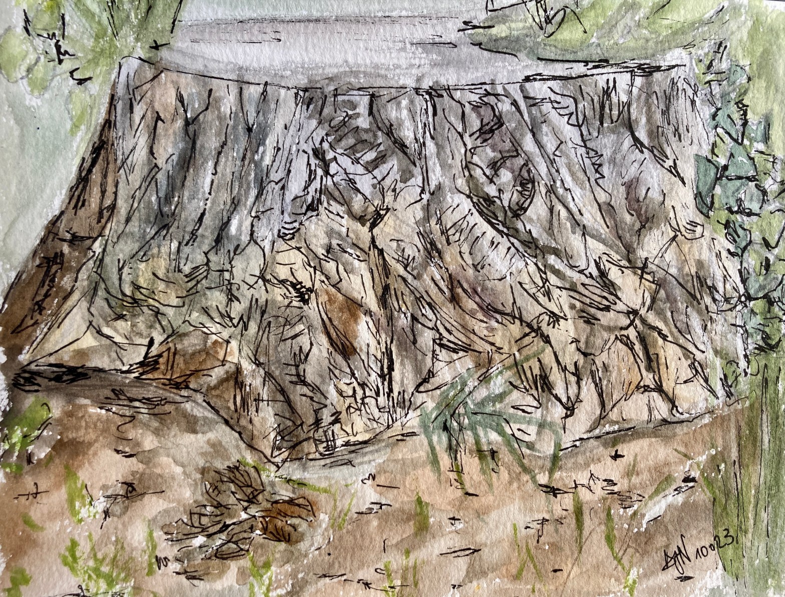 Dans le parc du château, au bord du grand lac, un énorme peuplier a été coupé. Il n’en reste qu’une grosse souche, perdue dans le lierre et la végétation. Et à l’écorce très découpée. J’étais passée plusieurs fois devant et m’étais dit qu’un jour, je la peindrai. J’ai réalisé ce croquis aquarellé un dimanche après-midi.Lire la suite « Souche »