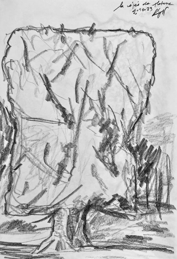 Cépée de platane en octobre, le retour. J’aime cette saison au parc de Morsang : les arbres commencent à se teinter de rouge et d’ocre, doucement mais sûrement. La cépée de platane est encore verdoyante, mais l’automne est bien là. Après un après-midi studieux, je décide de mettre en application les cours de dessin de la Licence : dessiner, toujours, essayer différents médium, différents supports. Comment joindre l’utile à l’agréable ? Dessiner en plein air. Je vais croquer la cépée de platane. J’ai réalisé 2 croquis différents. L’important, c’est cette forme typique. Mais le rendu est très différent : j’ai commencé au crayon, qui m’est plus familier, puis j’ai réalisé un dessin au feutre d’encre de Chine. J’ai pour cela utilisé deux couleurs, celles que j’avais dans ma trousse aujourd’hui : je dessine donc avec cette contrainte, et j’apprends.