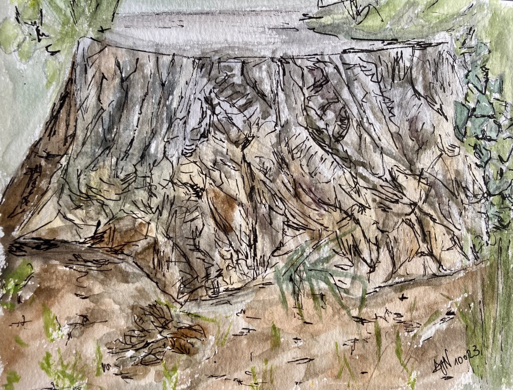 Dans le parc du château, au bord du grand lac, un énorme peuplier a été coupé. Il n’en reste qu’une grosse souche, perdue dans le lierre et la végétation. Et à l’écorce très découpée. J’étais passée plusieurs fois devant et m’étais dit qu’un jour, je la peindrai. J’ai réalisé ce croquis aquarellé un dimanche après-midi. D’abord un rapide croquis au crayon, le temps de familiariser mon œil avec le relief et les détails nombreux, puis la couleur, enfin les traits d’encre dessinés au feutre. Au-delà du sujet, cette peinture représente un bon souvenir, celui de ce moment passé en tête-à-tête avec cet arbre. Une halte fraîche, ensoleillée et colorée. Dans la douceur automnale.