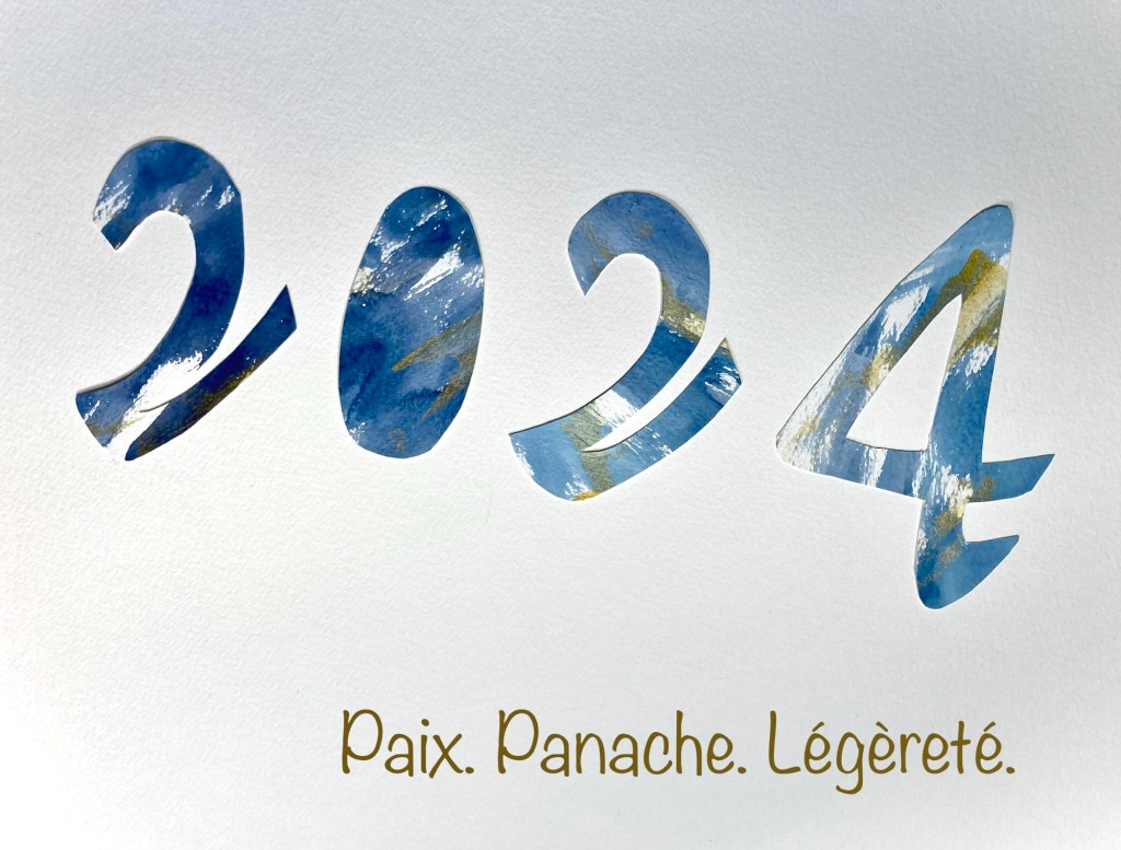 Il n’est pas encore trop tard : bonne année 2024. J’ai réalisé cette carte à partir d’un petit jeu de découpage puis collage des chiffres sur gribouillage d’aquarelle (à l’envers donc fait de hasard pour le rendu de chaque chiffre). Ce collage pris en photo, j’ai alors procédé à un bricolage numérique sur iPhone pour ajouter les 3 mots. 2024 sera meilleure que 2023, j’en suis sûre. Pour m’en convaincre, un mantra qui correspond bien à mon état d’esprit du moment, et que chacune et chacun peut s’approprier, à l’intérieur et à l’extérieur.