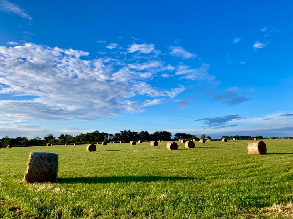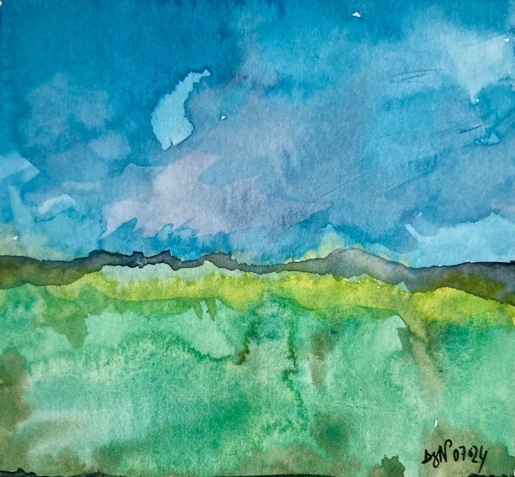 Un coucher de soleil de plus. Au bord de la mer, mais pas vraiment quand même. Pas de ciel orange éclatant se reflétant sur l’eau calme. Et pourquoi pas ? Hier soir, je n’étais pas face à l’océan : le soleil a embrasé les champs de Belle-Ile. Plénitude malgré tout. Et pensées. La pleine nature, la lumière rasante, le silence, le repos. Un cadeau d’autant plus précieux que la journée a été maussade. En cette matinée à nouveau pluvieuse, où il fait bon rester au sec à la maison, j’en ai peint une interprétation, ou plutôt, un souvenir. Que faire avec ce bleu et ce vert, puisque c’est l’image que j’en ai retenue ? Je peins des petits formats à l’aquarelle, me concentrant sur mes sensations face à ces couleurs lumineuses. L’eau m’aide à trouver le geste. Cette version est la plus aboutie.