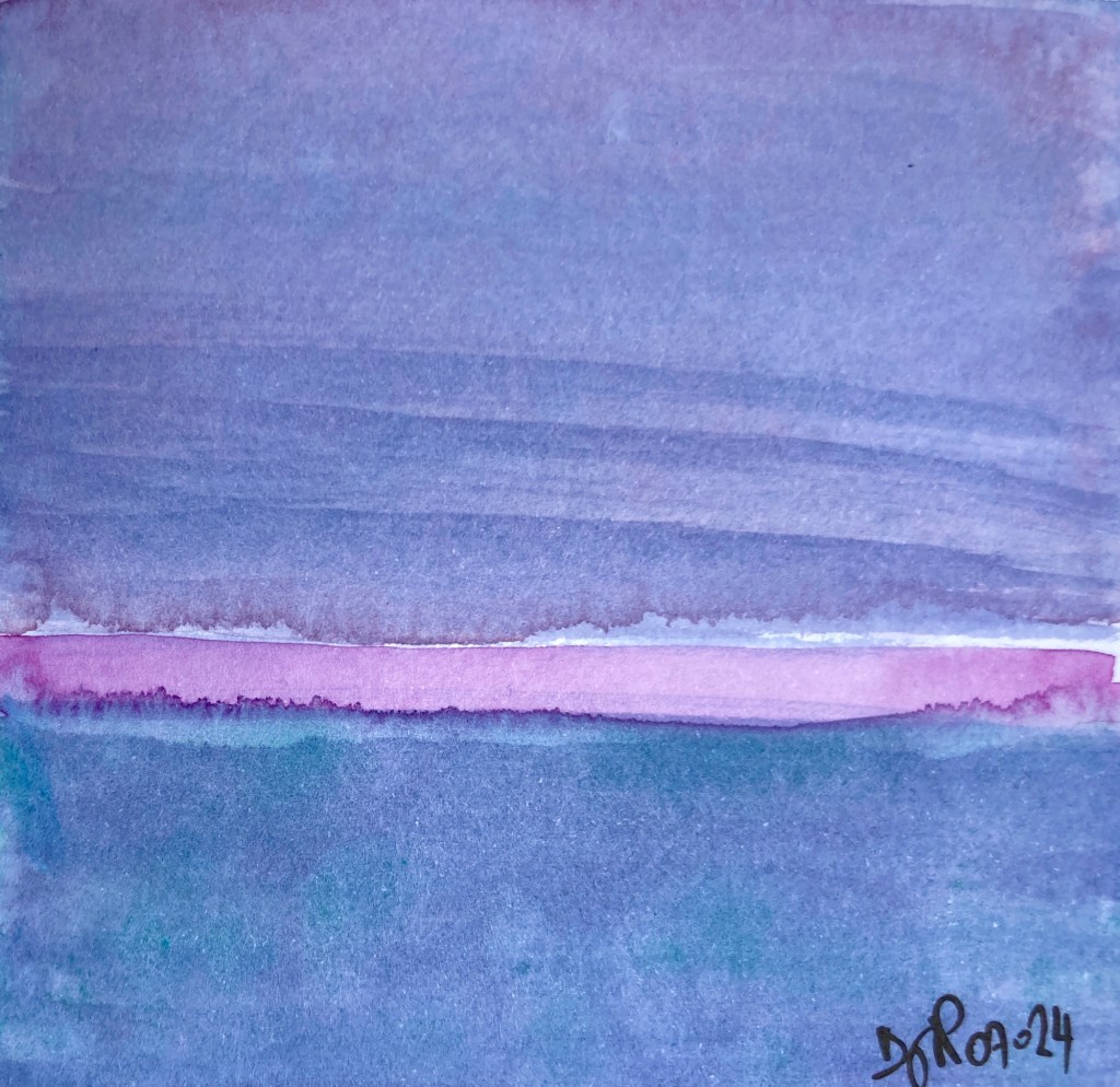 Fin de nuit, je passe un œil par la fenêtre : le lever du soleil est rose et gris à l’horizon. Je retourne me coucher et peins à mon réveil le souvenir de ce moment rose. Toujours sur le papier lisse de mon carnet d’été offert par Mimi. Je joue avec les textures de mon pinceau. Des traits, des touches, qui font mouche.