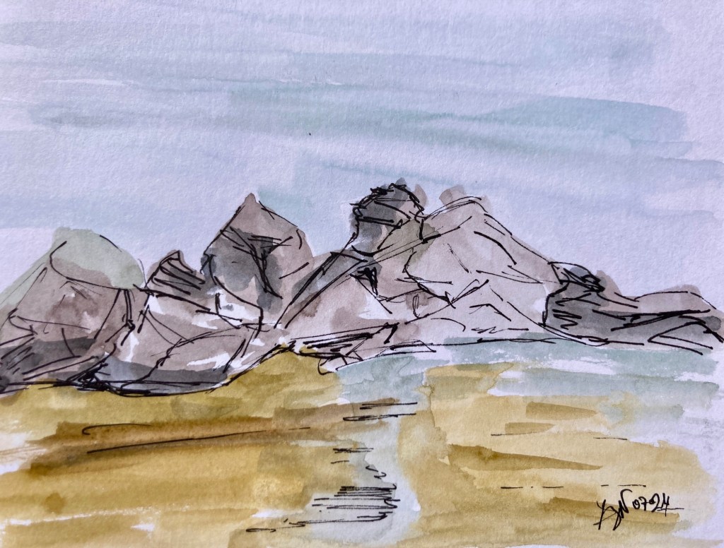 Petite pause sur la plage de Donnant aujourd’hui. Elle est toujours aussi belle. Je me pose dans le sable avec mon carnet et peins sur le motif ce petit format face au soleil. Il s’agit des rochers bordant la plage. Le bruit des vagues et des gens qui s’amusent en cette belle journée accompagnent mon pinceau. La vie, quoi.