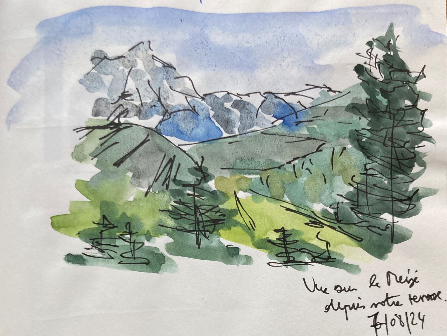 Cette région et ces sommets font rêver, je les ai côtoyés cet été à La Grave. Pour ce carnet de voyage, mon matériel est minimal, léger dans le sac à dos. Ecriture et dessin quotidiens. Je me promène sur les sentiers, je me promène sur le papier.