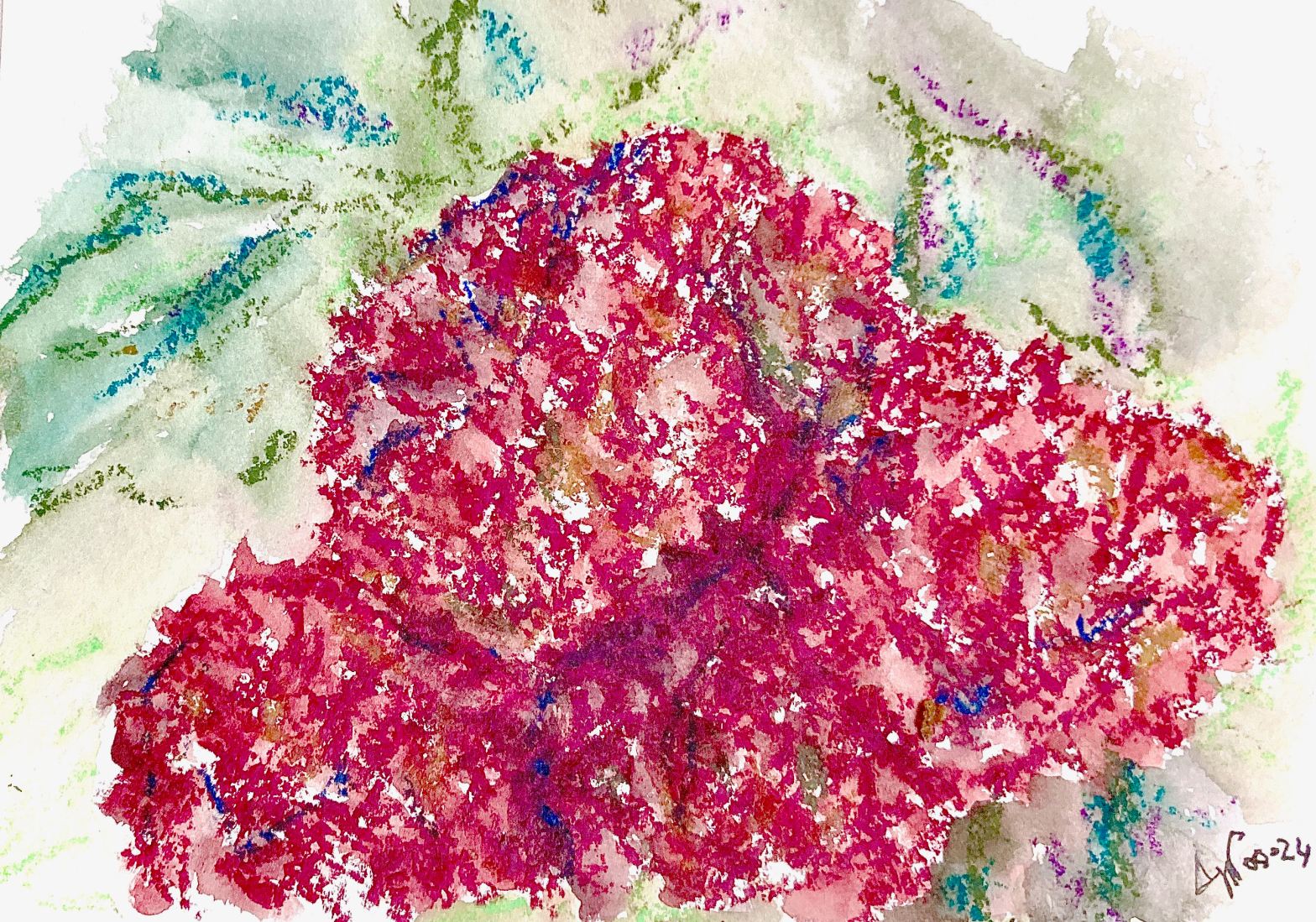 Les hortensias fin août sont un peu fanés mais ils sont encore bien là et incarnent toujours la Bretagne avec panache et fidélité. J’ai croqué rapidement quelques têtes d’hortensias qui fleurissent généreusement dans les jardins. Format modeste certes, mais c’est une petite victoire car cette fleur reste pour moi très difficile à dessiner.