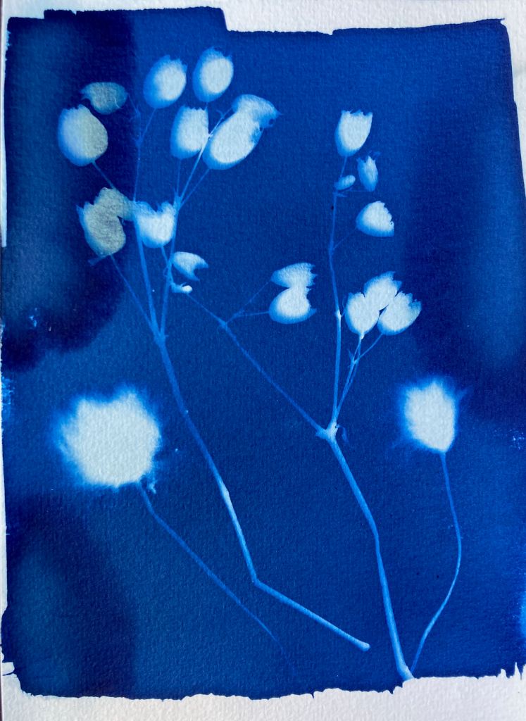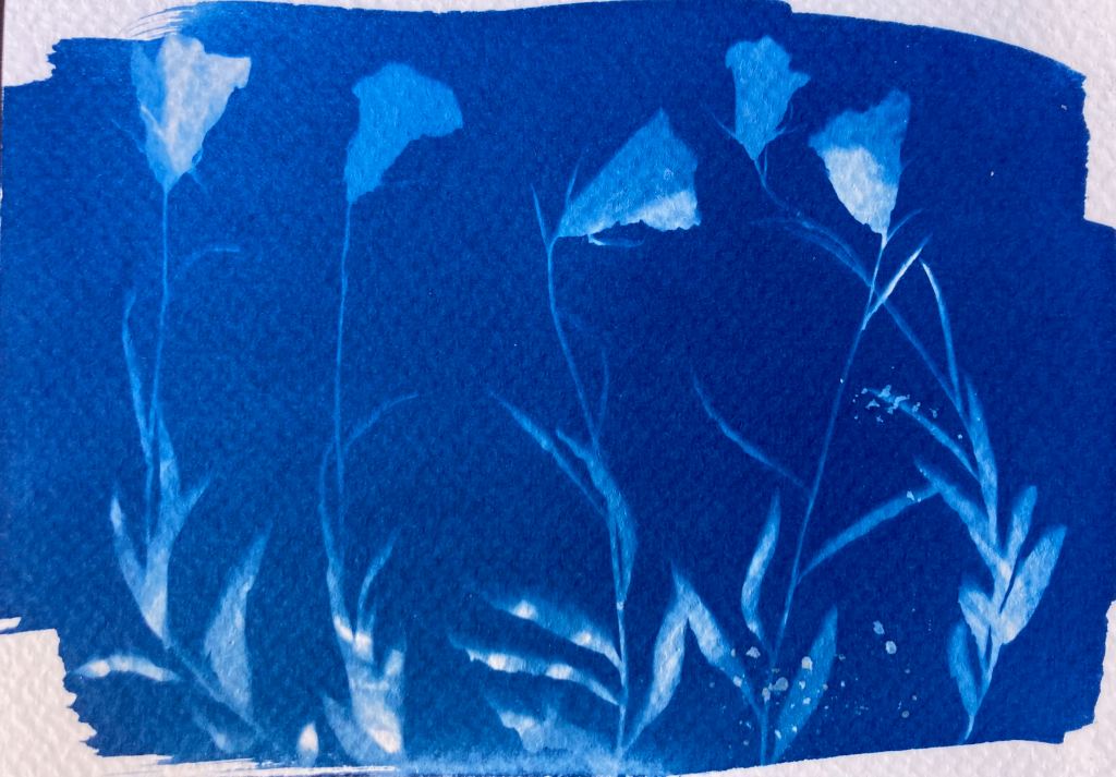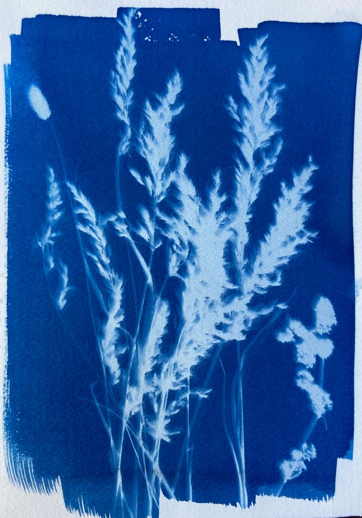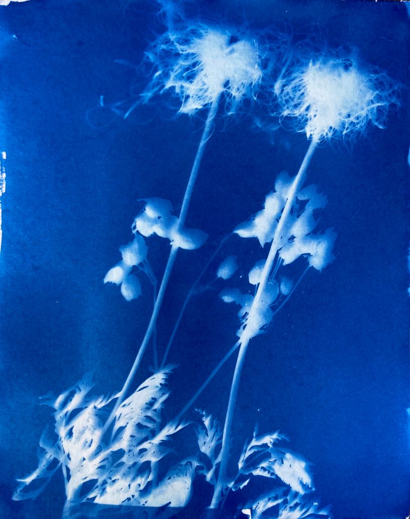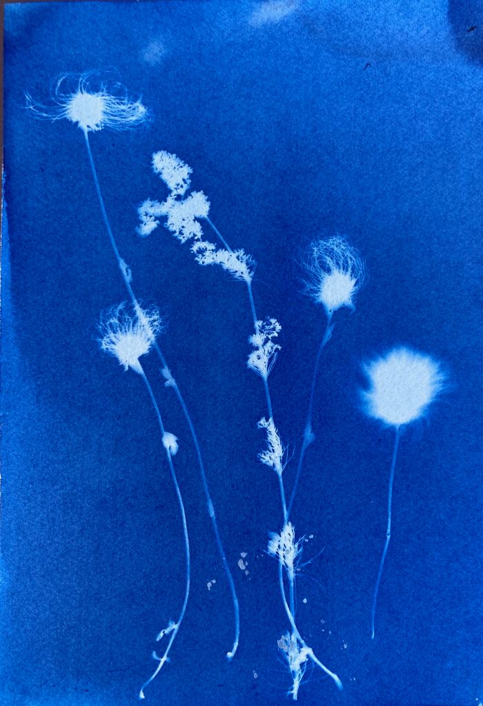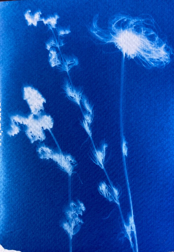 J’ai glané par-ci par-là quelques fleurs à la faveur de mes randonnées du mois d’août, lorsque je n’étais pas dans le Parc National des Ecrins. Mon objectif était de ramener des souvenirs végétaux, empreints d’impression de grands espaces et de bien-être, et de les immortaliser en tirages de cyanotypes. Le transport puis le séchage des fleurs a été toute une organisation ! J’ai fait beaucoup d’essais une fois rentrée à la maison, et je commence à y voir plus clair sur le type de papier à utiliser, le temps d’exposition, et suis à présent plus à l’aise avec les manipulations, même si mon « atelier » au jardin doit être à chaque fois installé puis rangé. Je trouve mon style, en mouvement, libre et flou ! La prochaine fois, j’utiliserai du papier aquarelle satiné, c’est lui qui donne les meilleurs tirages. L’application de la solution photosensible raconte elle aussi une histoire, sur laquelle se calent les motifs, c’est pourquoi je dois poursuivre mes recherches à ce sujet. En tout cas, j’aime la liberté et l’autonomie que prennent ces motifs au moment de leur révélation au soleil, et la poésie qui s’en dégage, s’adressant à la sensibilité et à la libre interprétation du spectateur. J’ai l’impression d’un moment suspendu et d’une douceur silencieuse.
