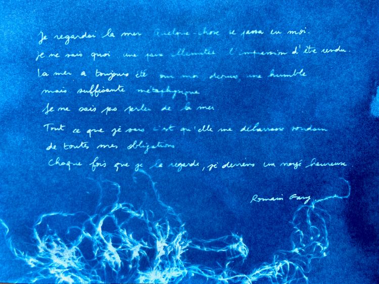 Il y a quelques mois, je suis tombée par hasard sur cet extrait magnifique du roman La promesse de l’aube de Romain Gary. Ce texte m’a prise par surprise. J’ai eu l’impression forte et étrange qu’il s’adressait à moi, qu’il m’était familier. Il m’apaise. Je le trouve dramatiquement beau. J’ai alors eu l’idée de le rendre aquatique. Je le voulais liquide et ponctué par des algues. J’ai réalisé de multiples essais, plus ou moins convaincants ; j’ai tâtonné, échoué, apporté des corrections. Puis un jour de septembre, les mots, le papier et le soleil sont enfin tombés d’accord pour m’offrir ce talisman.