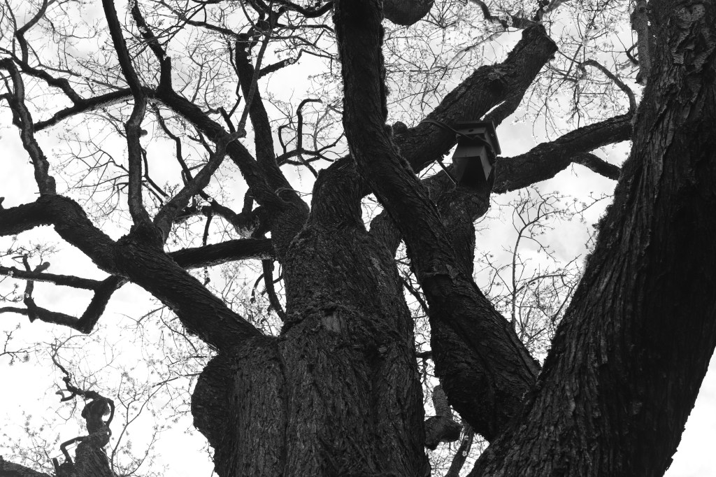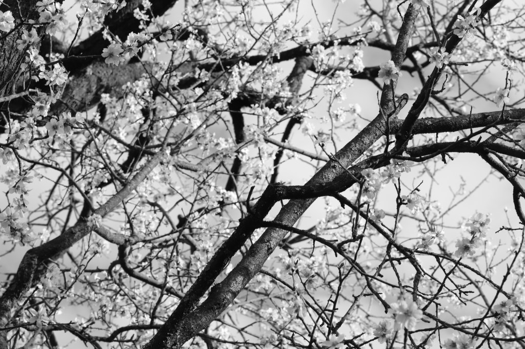 Aujourd’hui, mon amandier n’est plus, abattu en avril car il menaçait de tomber, ses racines atteintes par un champignon ne le maintenant plus solidement dans le sol. Cette série photographique silencieuse lui rend hommage : je l’ai réalisée au printemps pour un devoir de photographie sur l’incitation « transfigurer le banal ». Cet arbre faisait partie du décor mais était bien plus que cela.