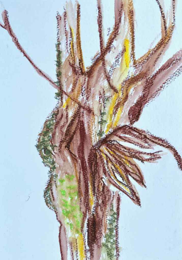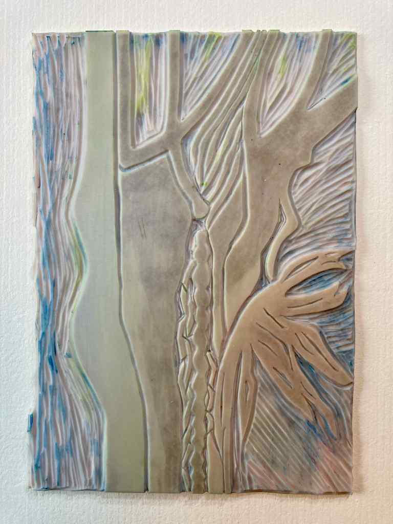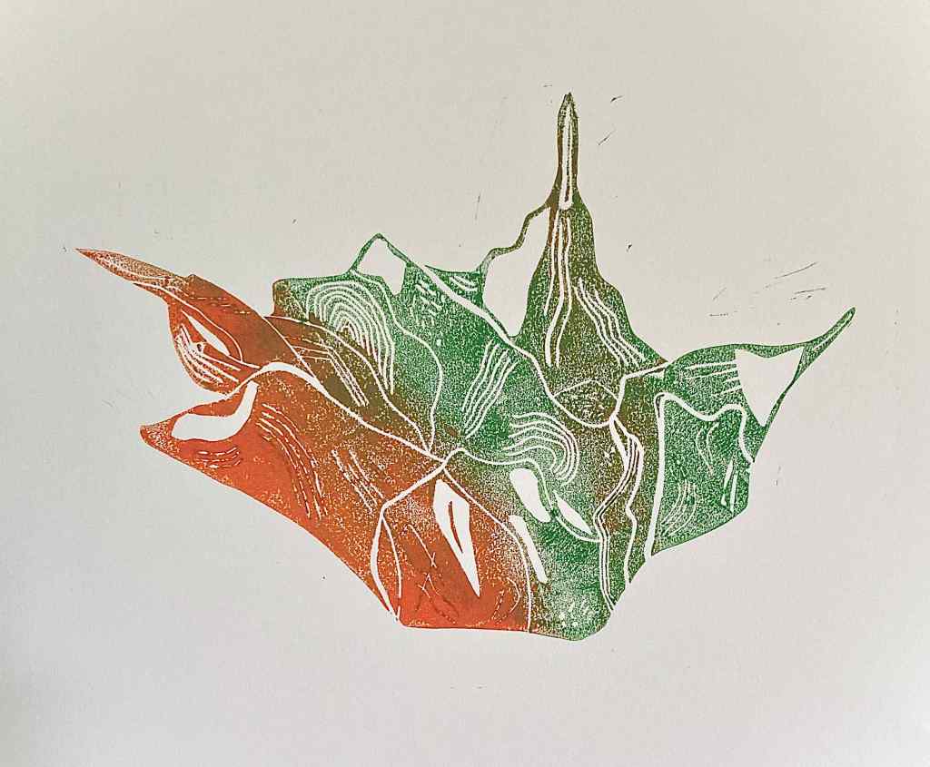 A la faveur d’un stage de gravure en Puysaye, au Nord de la Bourgogne, avec l’artiste Yannick Charon (https://yannick-charon.jimdofree.com), j’ai réalisé une gravure à partir de dessins d’observation sur le motif. La traduction en estampe d’un croquis ou d’une peinture est un monde à explorer ! La recherche des couleurs m’apparaît infinie elle aussi. C’est pourquoi une fois rentrée chez moi, je me suis attelée à une seconde gravure. Je remarque à cette occasion que ma démarche artistique mûrit, et que les motifs géométriques sont souvent présents, et que le végétal et le minéral parfois se rapprochent. Voici comment j’ai procédé pour réaliser ces deux linogravures : tout d’abord, j’effectue un dessin ou une peinture sur le motif, puis une simplification de celui-ci à l’atelier en préparation de la plaque à graver (étape passionnante). Ensuite je trace le dessin sur la plaque avec un crayon à papier gras (le crayon 8B fonctionne très bien). Vient ensuite la gravure avec les gouges adaptées, suivie d’une première impression pour corriger les imperfections et préciser la gravure finale. Enfin, c’est le moment des séries d’impressions, avec la recherche permanente des bonnes couleurs, au bon endroit, pour donner du relief. L’impression se fait soit à la cuillère, en appuyant en faisant des cercles, ou au baren, tampon arrondi assez dur permettant d’économiser un peu les bras par rapport à la pression à la cuillère. J’ai utilisé plusieurs types de papiers, et compte tenu de la qualité de mes plaques de lino et de celle des encres utilisées (elles ne sont pas idéales), le papier lisse d’un grammage de 160 à 250g/m2 est celui qui permet le meilleur rendu. Cela faisait un moment que je n’avais pas pratiqué la gravure, mais j’aime beaucoup cette technique (même si je trouve cela fatiguant pour le bras). En effet, les deux moments-clés du dessin à graver puis de l’application de la couleur sont très stimulants artistiquement, et ils offrent une surprise à chaque fois. Les imperfections sont parfois très riches. Le moment de la gravure avec les gouges n’est pas ce que je préfère, mais reconnaissons-lui un pouvoir relaxant incroyable. Je remercie chaleureusement Yannick pour ce stage amical, technique et culturel, qui m’a apporté beaucoup ; et un grand merci du coeur à ma douce Stéphanie pour avoir provoqué ce beau moment artistique.