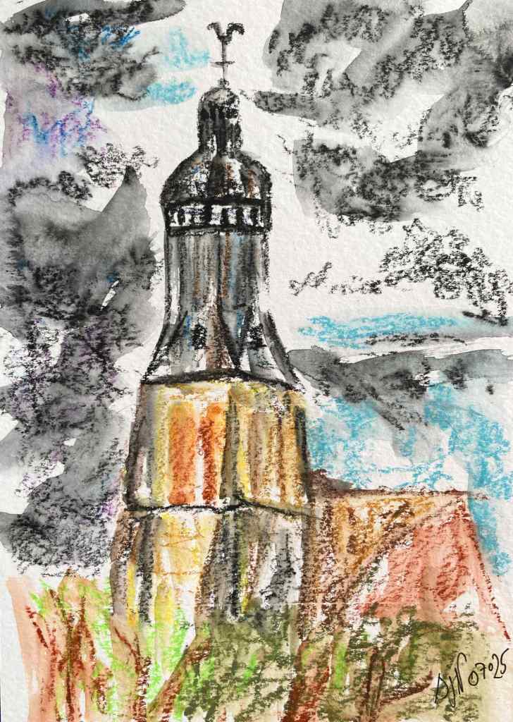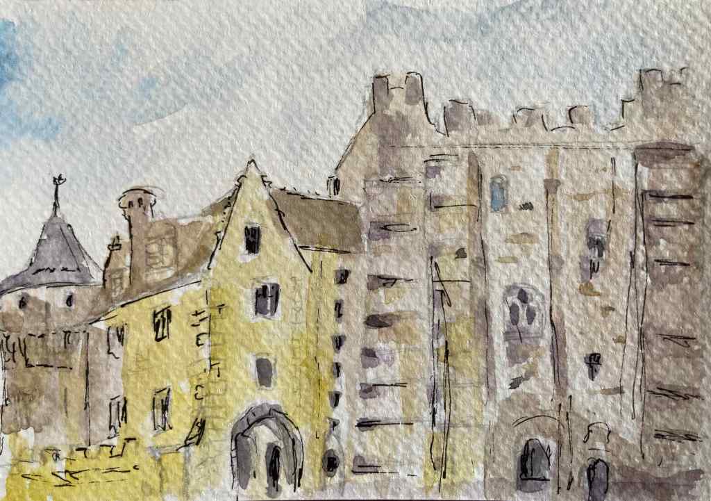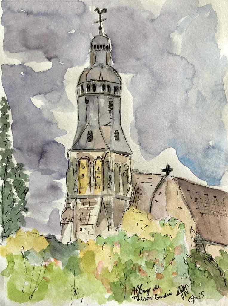 Je me suis échappée deux jours chez Michèle et Marc, dans leur belle maison familiale de la Coudraye, dans le Perche. Merci à eux deux pour leur accueil chaleureux, gourmand, attentionné, à leur image. Je suis heureuse de les avoir pour grands-cousins par alliance ! Nous sommes allées peindre avec Michèle : voici ce que j’ai peint dans le joli parc de l’Abbaye de Thiron-Gardais (deux versions : en aquarelle et en craies grasses aquarellables), puis au Château des Comtes du Perches à Nogent-le-Rotrou (aquarelle format carte postale).